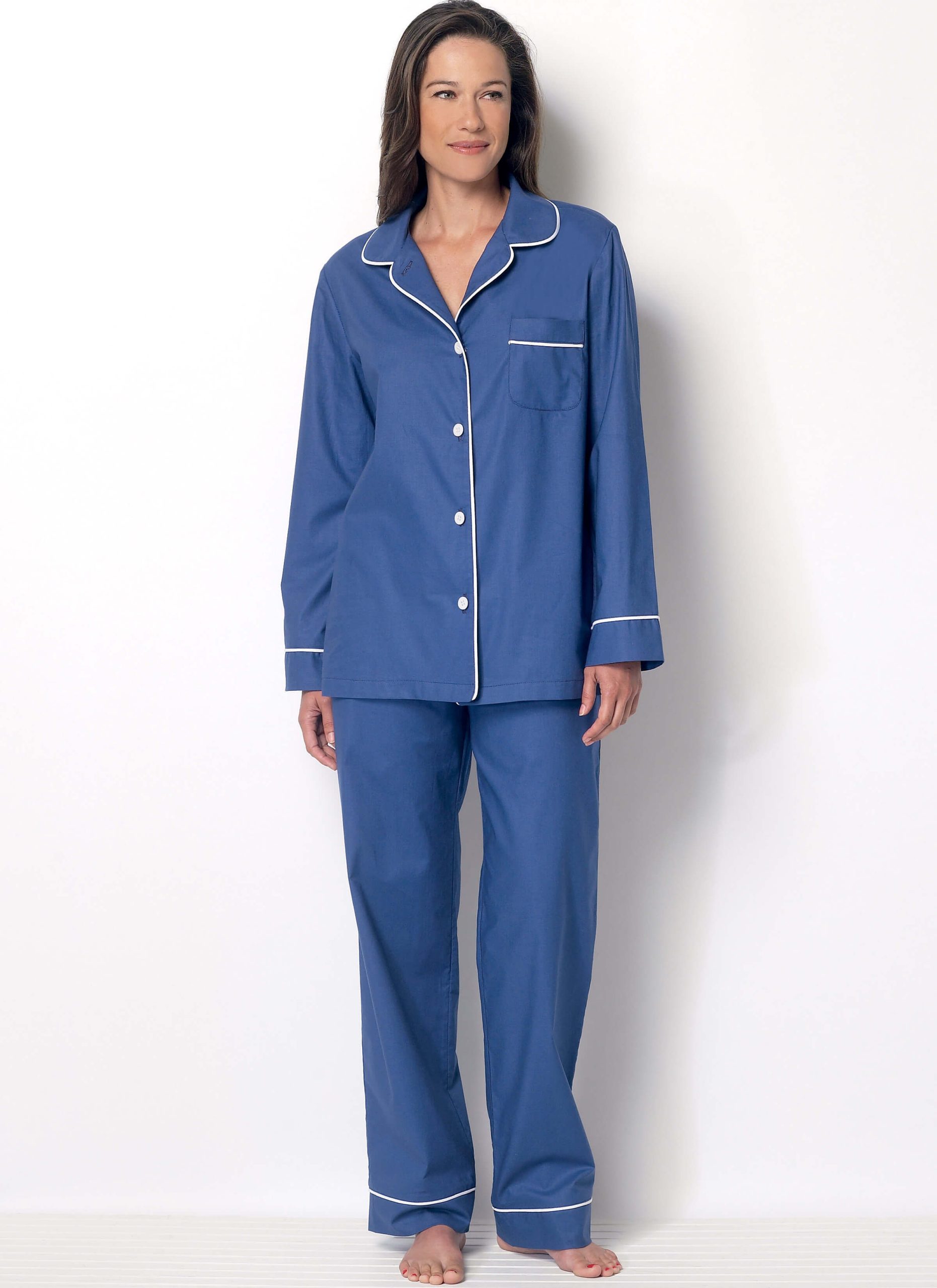 The ultimate PJ set pattern! B6296 features a loose-fitting button-down top with a collar and pockets as well as a pair of elasticated shorts or pants with side front pockets and a yoke back. Contrast piping elevates this set to luxury sleepwear. Try a cotton lawn in a fun print for a wonderful gift (to yourself or others!) or for something special sew this set up in a silk or satin.