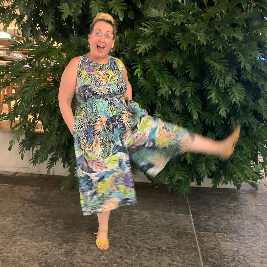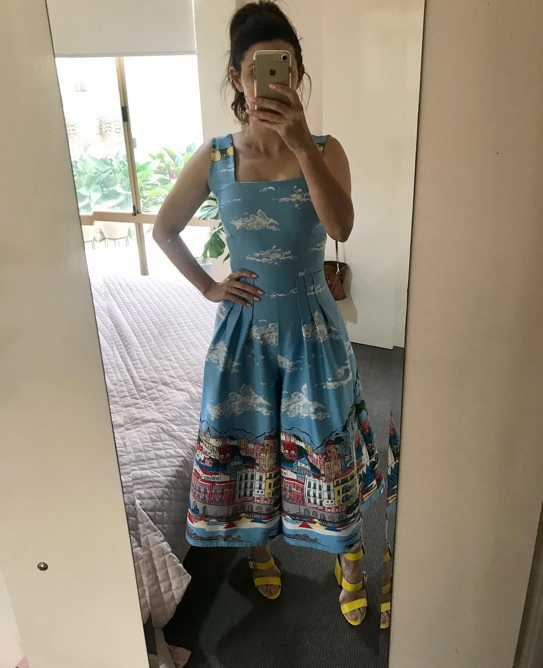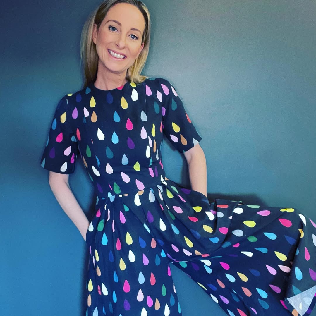 @juanitaflett celebrated her jumpsuit in this fun print from Doops Designs