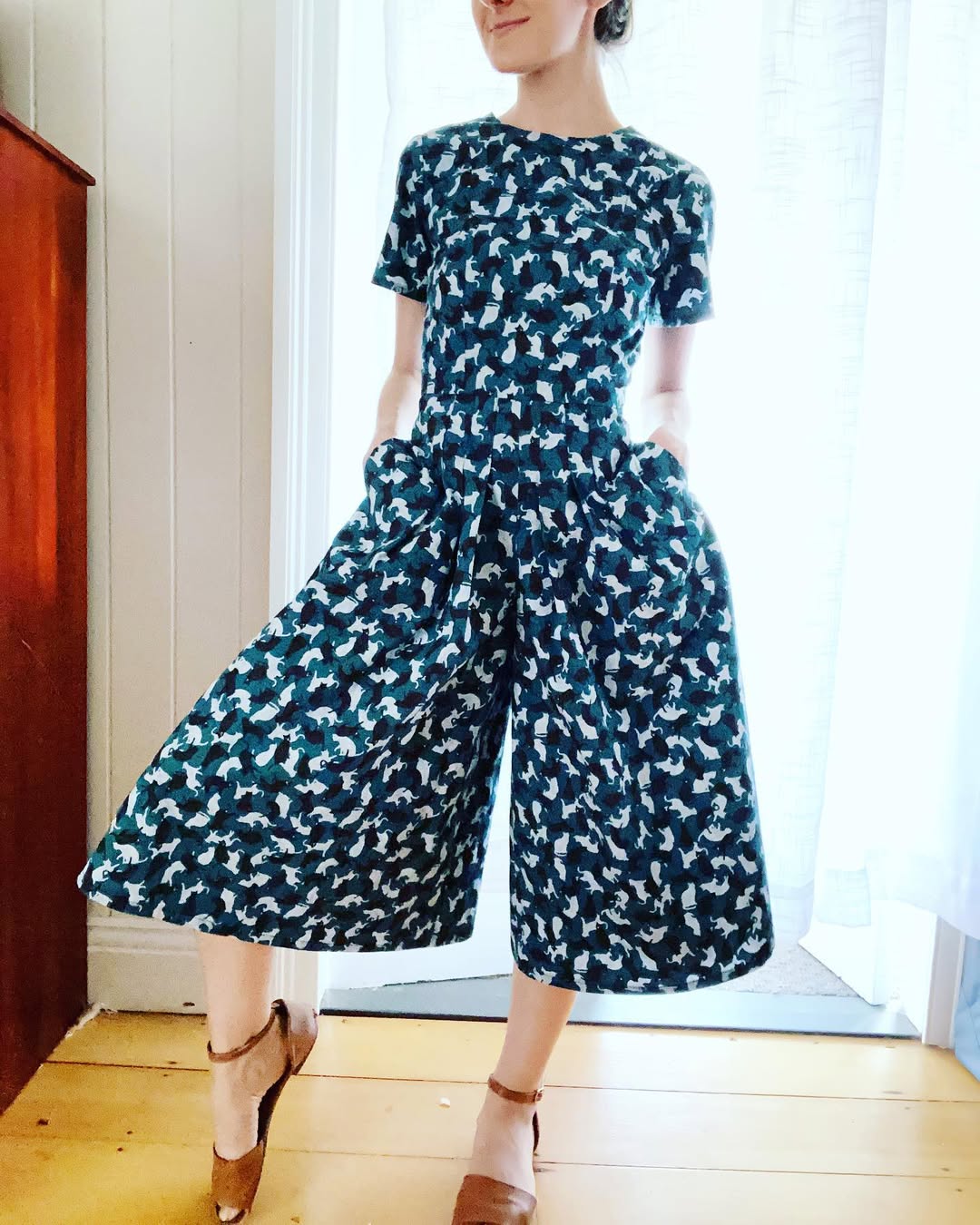@lexigorton created this Vogue jumpsuit in a playful cat print poplin
