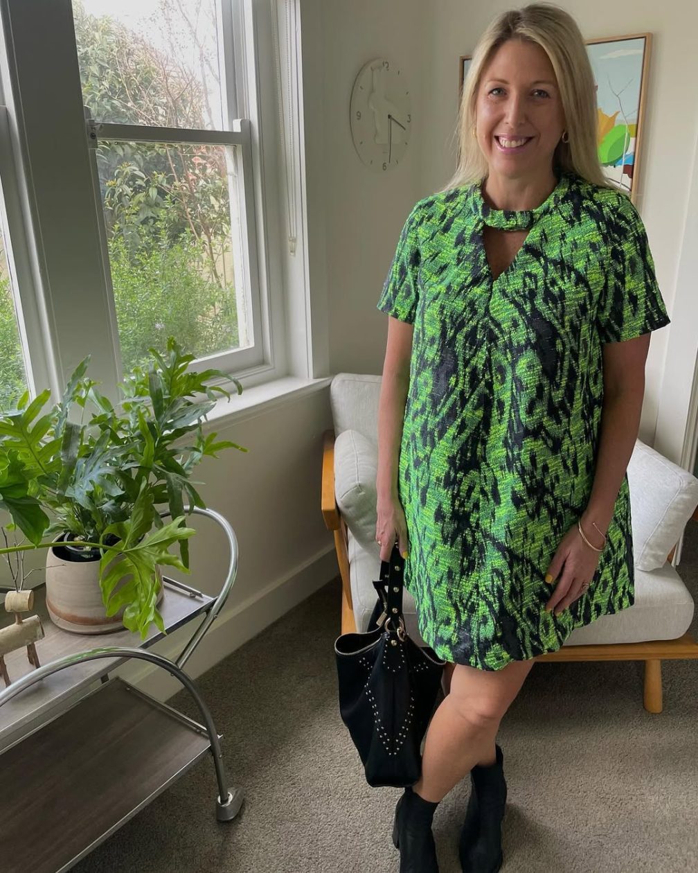 I designed a green dress for Liz’s night out with the girls, opting for a thicker jacquard fabric to suit early spring evenings. The choice added a touch of elegance and warmth, making it a standout piece for the occasion.