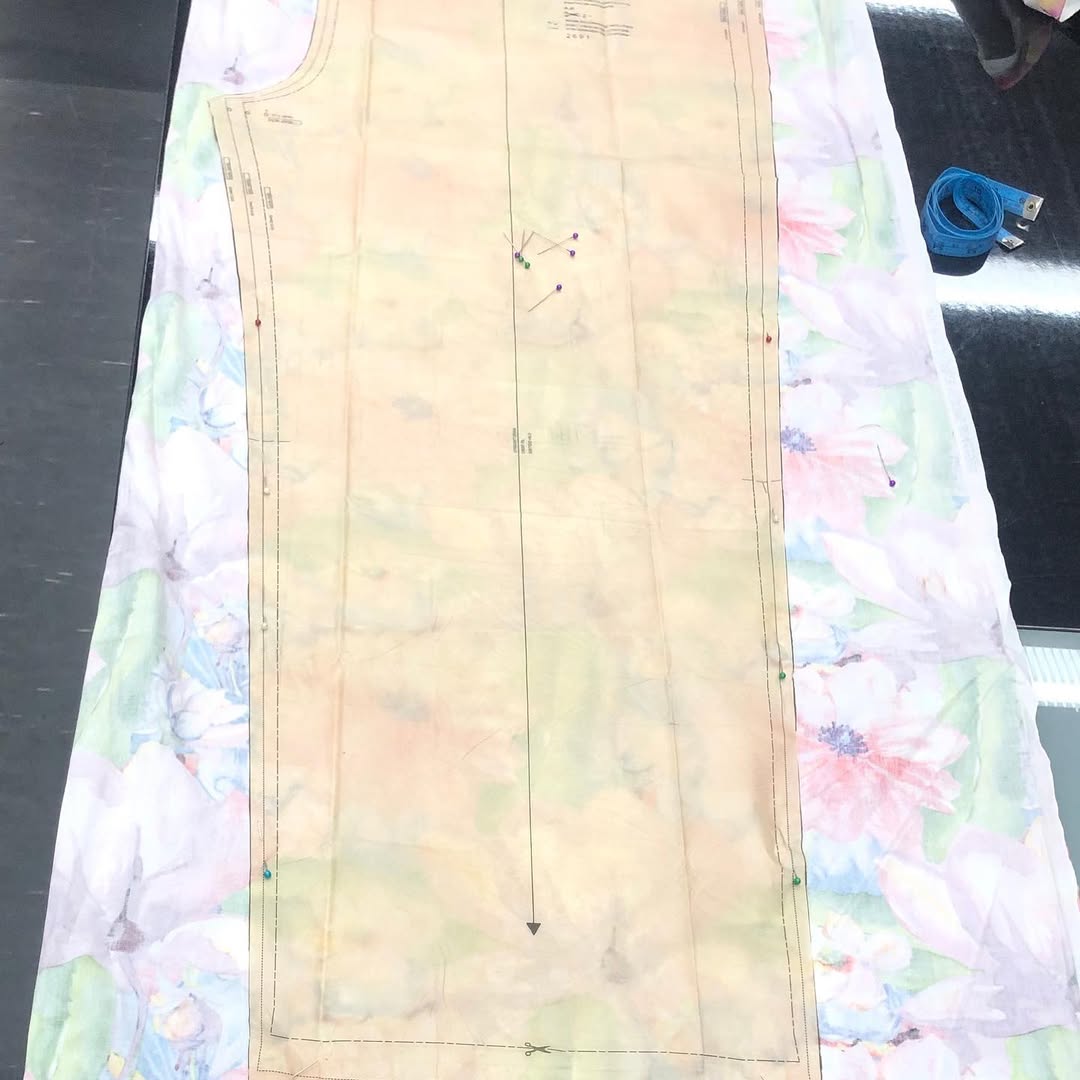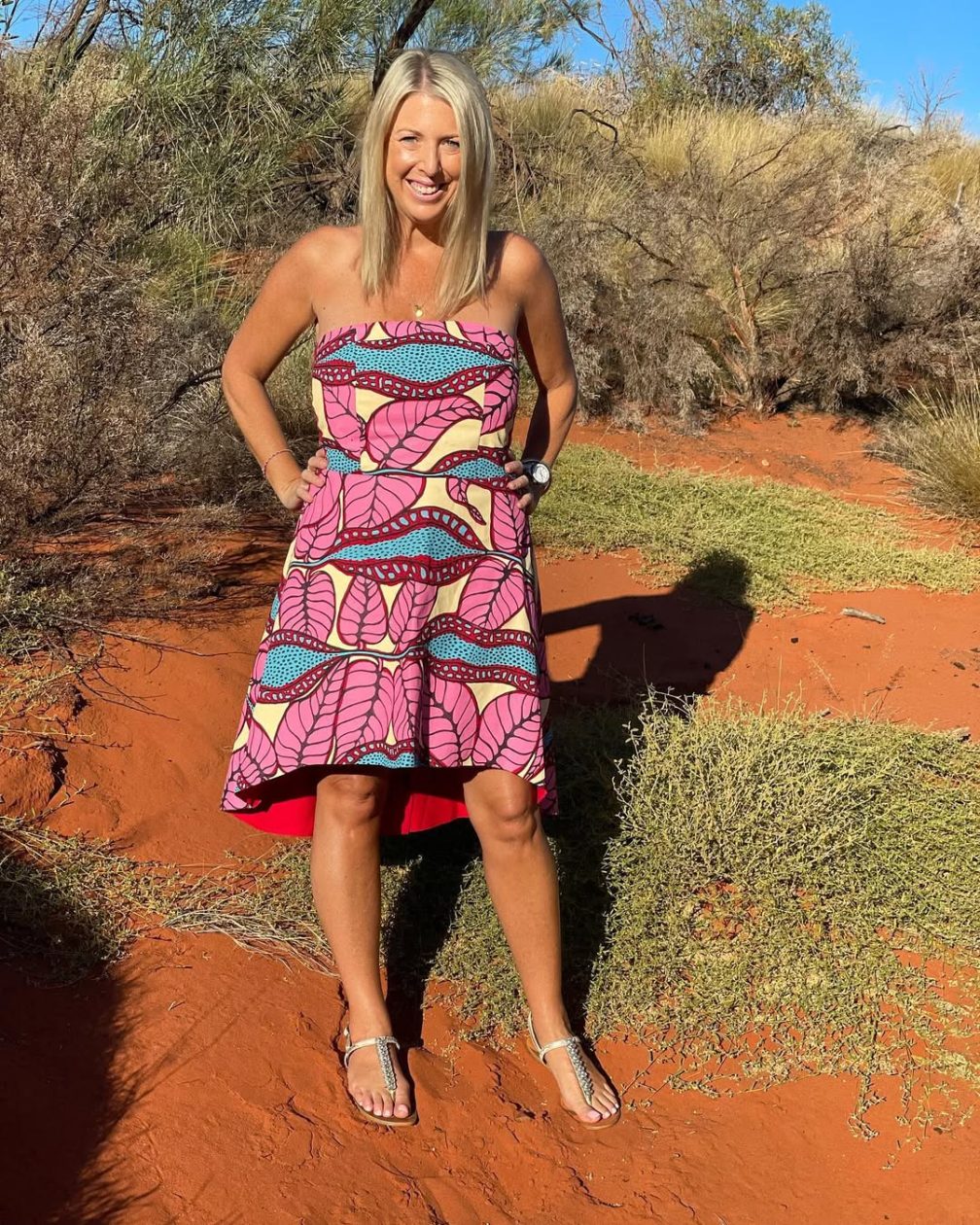 For our 25th wedding reunion at Uluru, I crafted a hi-lo dress using a cotton fabric from Ikuntji Artists with a thick screen print. The firm structure highlighted the vibrant red base, and the pattern hack added a modern twist to this cherished piece.
