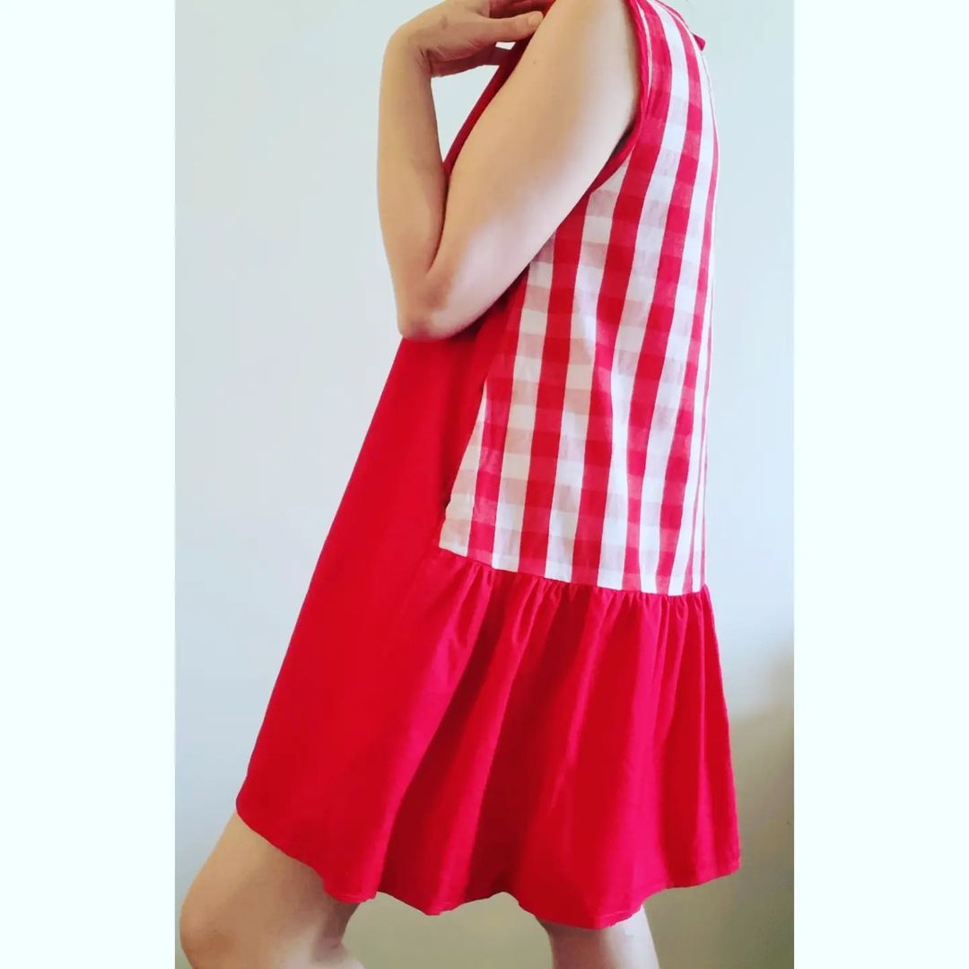 Vogue 9237 is a loose-fitting pullover dress that has button and loop closing at back neck. It can be sleeveless or have a short straight sleeve. The feature is a gathered panel across the lower back that can be created in a contrast fabric. We have spotted some amazing versions of this dress and wanted to bring them to celebrate our fantastic maker community! Find your copy of the pattern available in paper in size XS to XXL here.