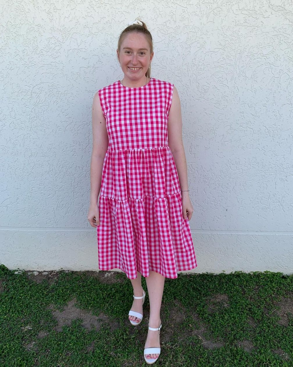 I would describe this dress as cinched waist but still have the twirl factor. It is perfect for all occasions from picnic to party. It has an invisible zip and bias binding finishes for the neck and arm holes. The body is made up of 6 pieces which you can have a lot of fun with. You can either use 1 fabric or several fabrics to mix and match and make a very eye catching dress. I combined 1/8 and ½ gingham which I absolutely love. I have also made this dress in a poplin and linen. I think a rainbow dress with each panel being a different colour/pattern would look amazing.