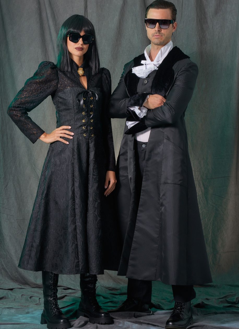 The Mournful Muse Corseted Dress Coat is Classic Goth, while the Mournful Gentleman’s attire features a Victorian Goth Funeral Coat.