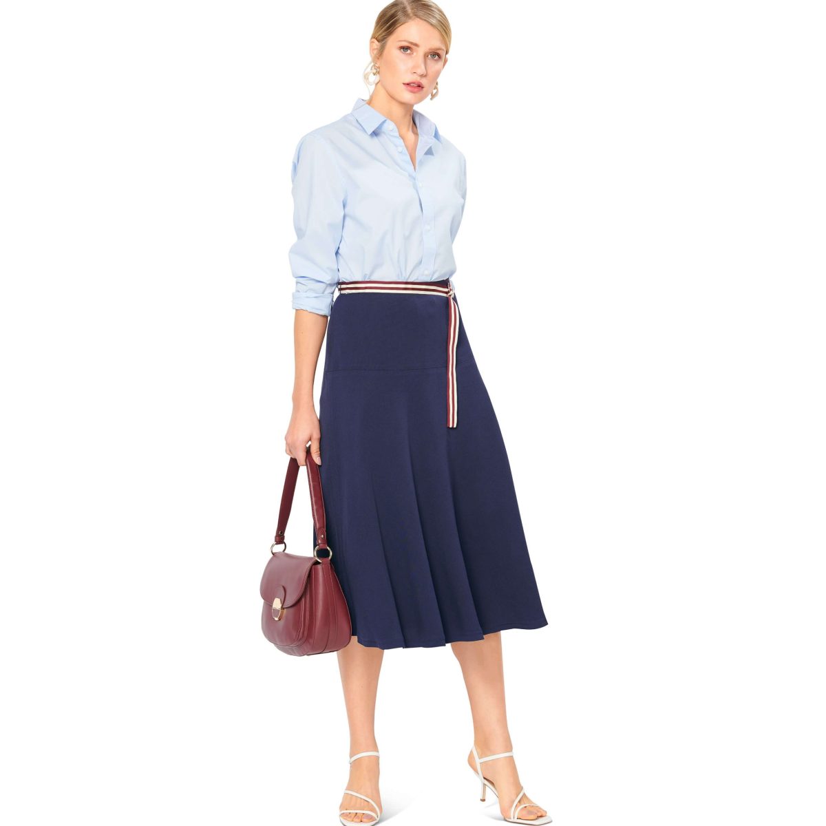 Semi-fitted skirts in two lengths with deep waistband, deep yoke to mid-hip and zip clsure. View A has semi-flared skirt and D-ring belt. View B, tiered longer length with dipped hem. Designed for viscose, crepe and lightweight cotton fabrics.