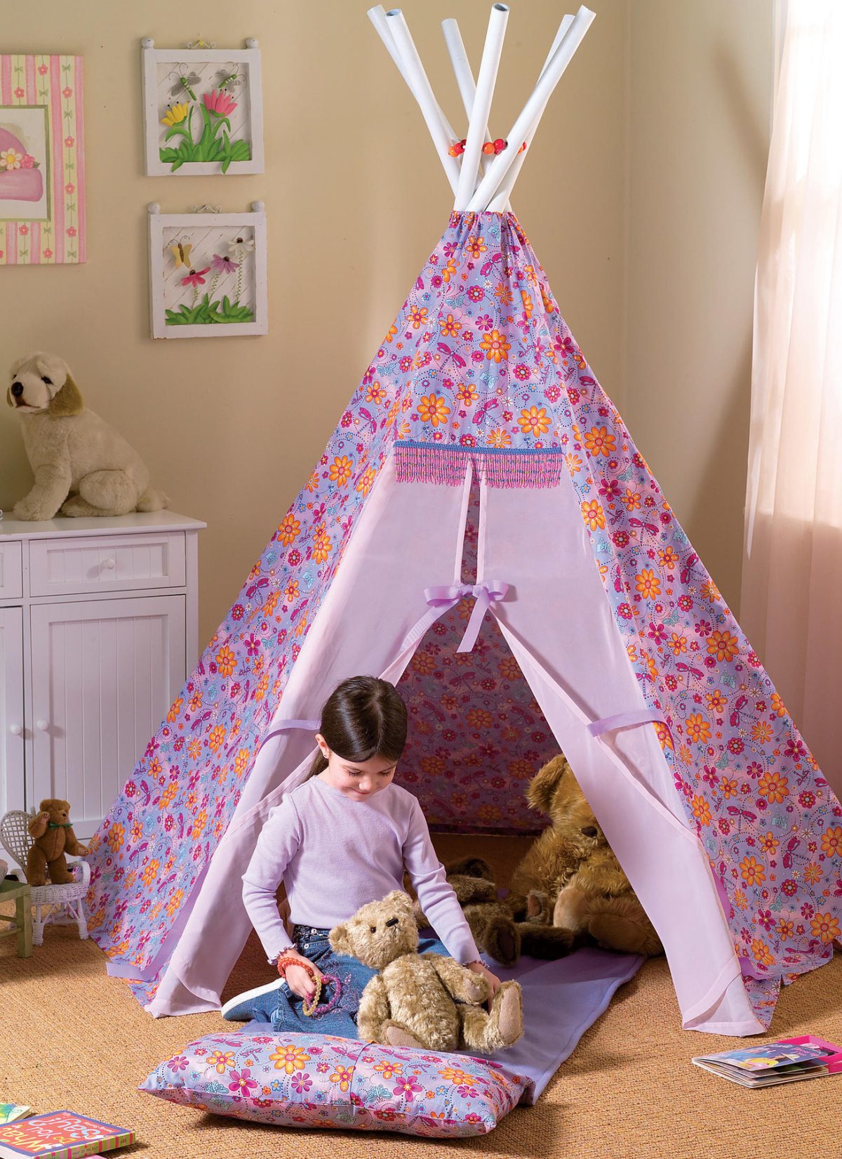 Package includes patterns and instructions to make Tepee A, B: Overall, 80″ x 72″ diameter; inside vertical clearance 55″. B: Contrast lower front sections. Mat and Pillow C: Open, 24″ x 58″, folded, 24″ x 13″, contrast mat top, separate inner pillow. Measurements are approximate and may vary with individual technique.