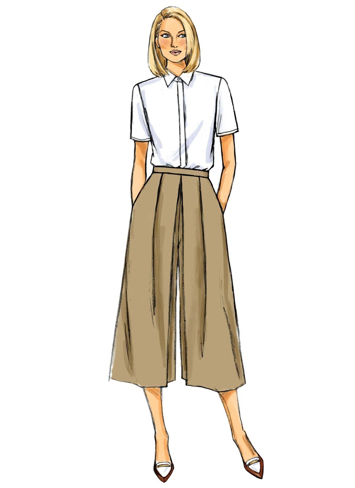 Culottes have waistband, side pockets and back zipper. A, B and C: pleat variations. D: semi-fitted.