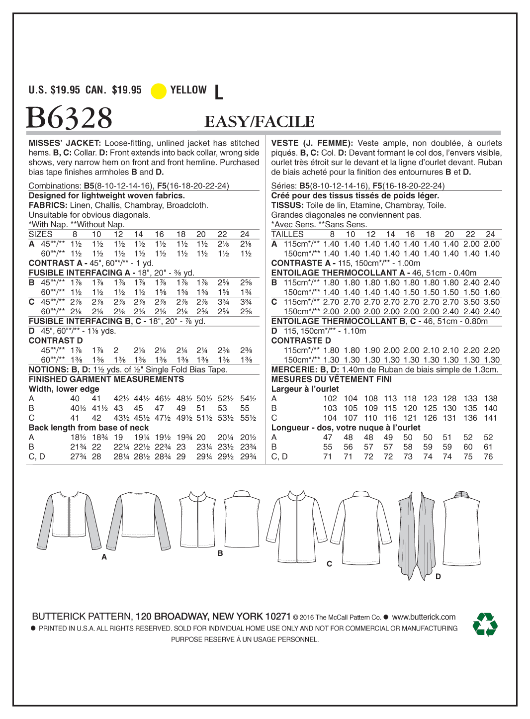 Butterick Sewing Pattern B6328 Misses’ Open-Front Jackets