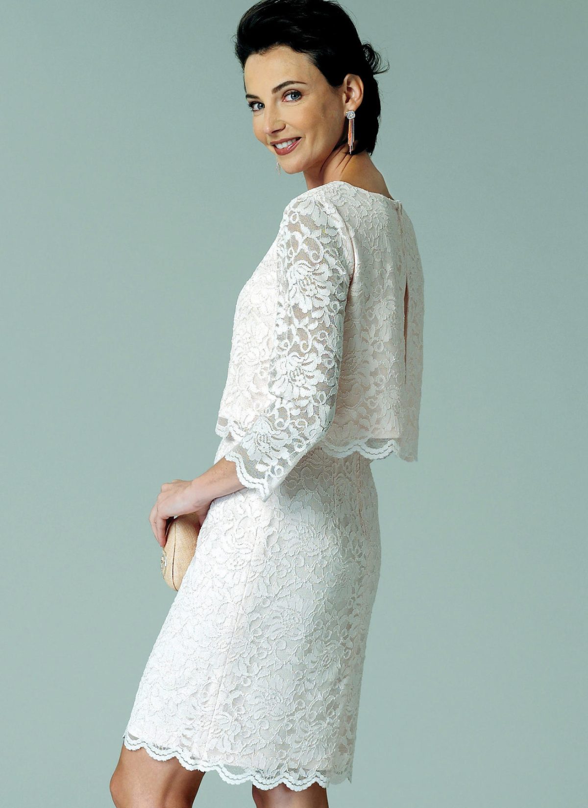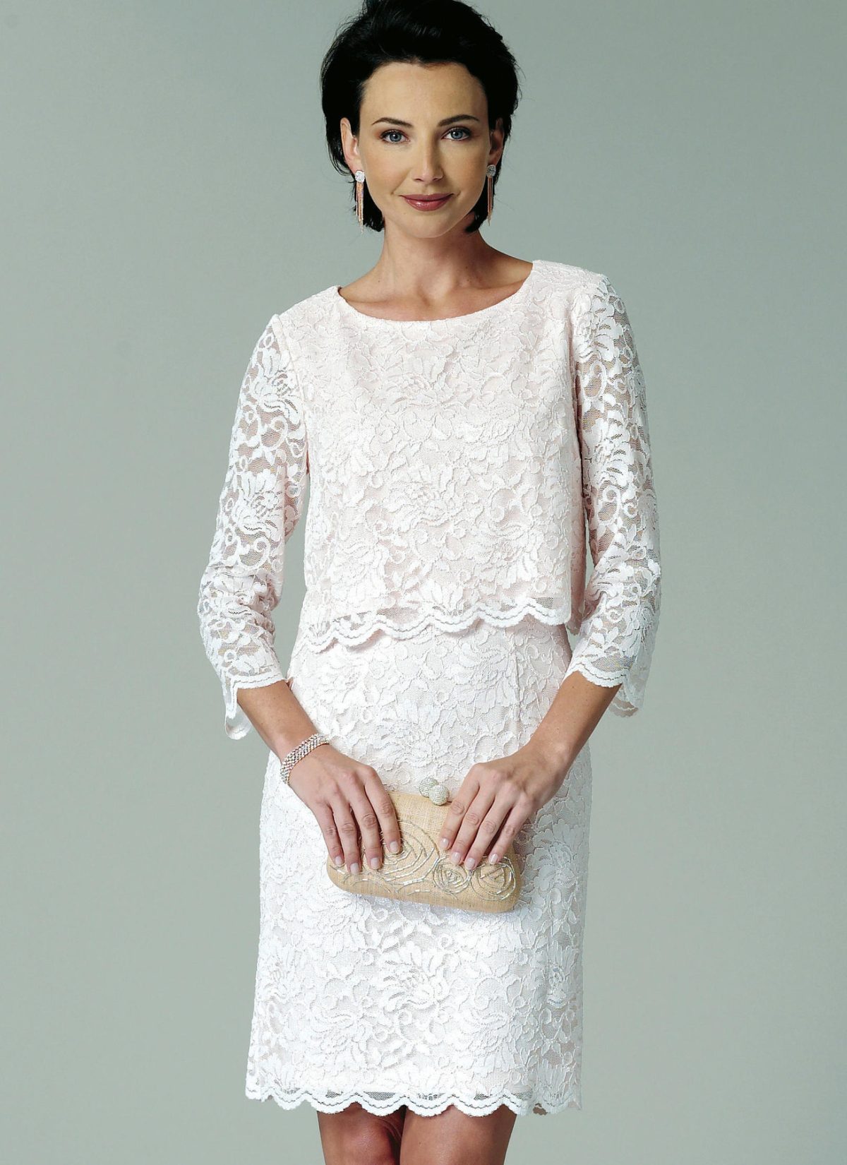 Dress, fitted through the bodice, has front and back overlays, sleeve and length variations. C: Double-edge scallop lace.