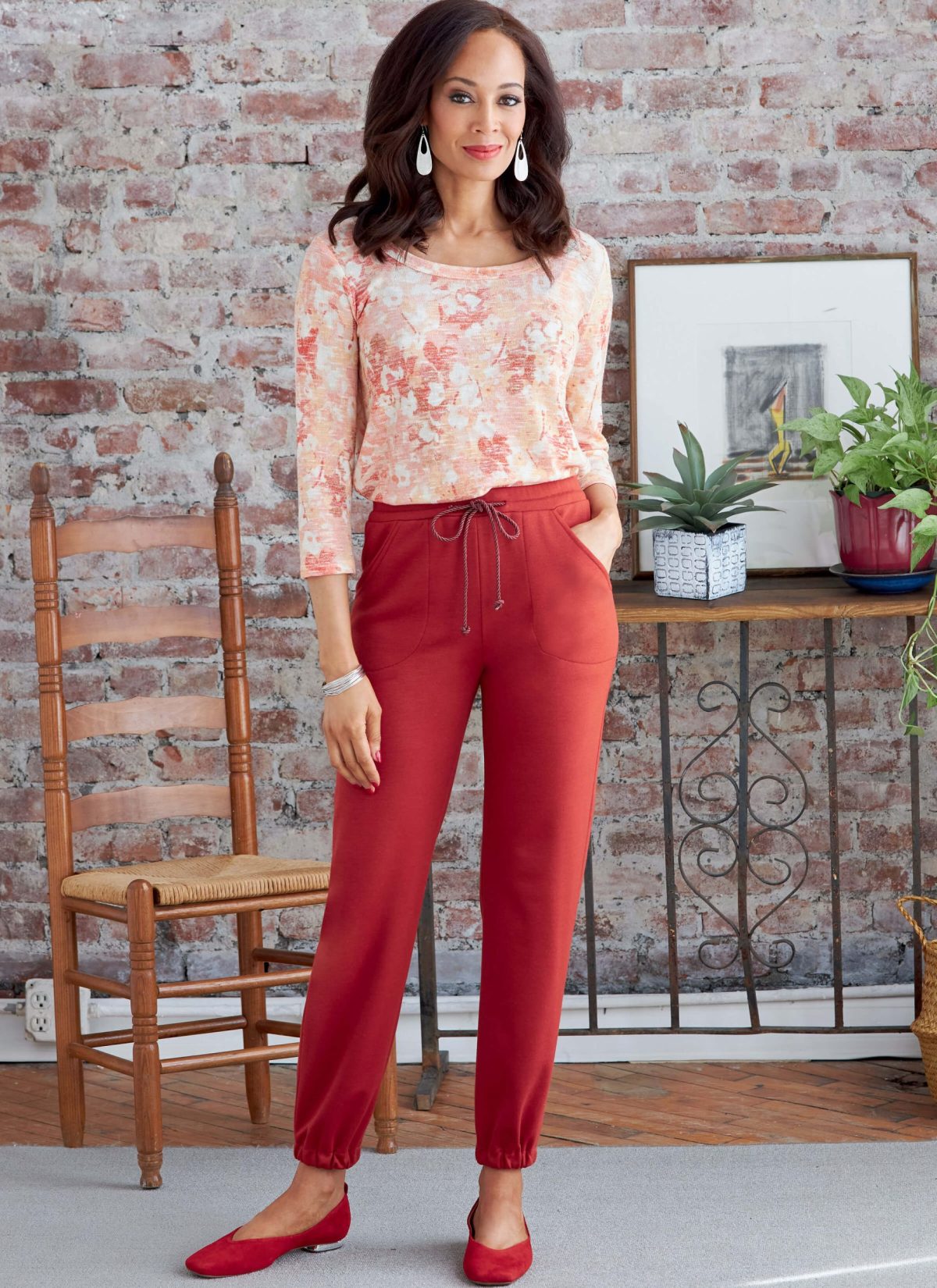 Misses’ pull-on trousers with elasticized waist, pockets and hem variations. Sewing Skill Rating: Easy.