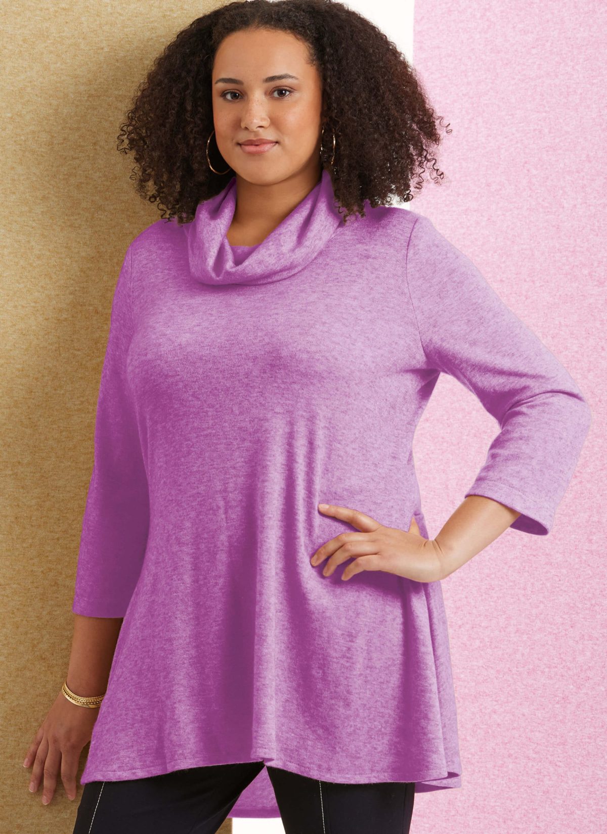 Pull-on knit cowl neck tops. Close- fitting through bust, flared high-low hems and set in sleeves. View A: 3/4 length sleeves. View B: tulip hem, button trim and long sleeves. Sew Rating: Easy.