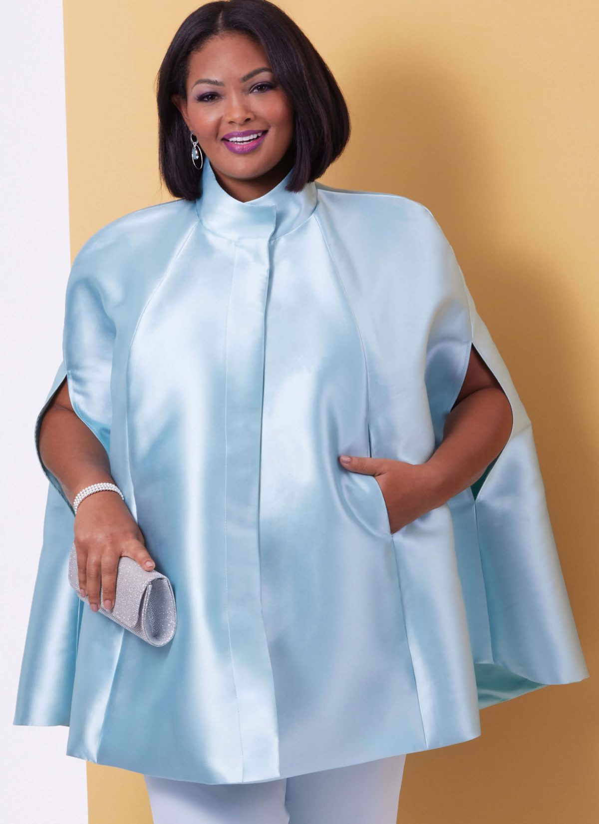Lined capes have stand up collar, side front pockets, side openings, concealed sew-on snap closure and length variations. Loose-fitting top has purchased bias facings, side slits and hem variations. Slim fit trousers have grosgrain waist facings, waist darts and invisible side zipper with hook and eye closure. Sew Rating: Easy.