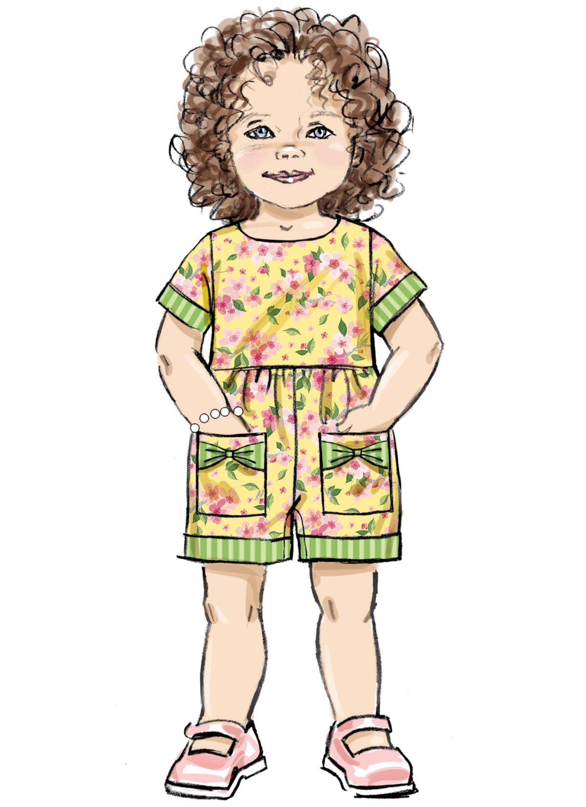 Dresses and rompers have bows on the pockets and an overlap back opening.  Views C and D have a snap crotch and contrast bands at legs. Short sleeves have contrast bands. Sew Rating: Easy.