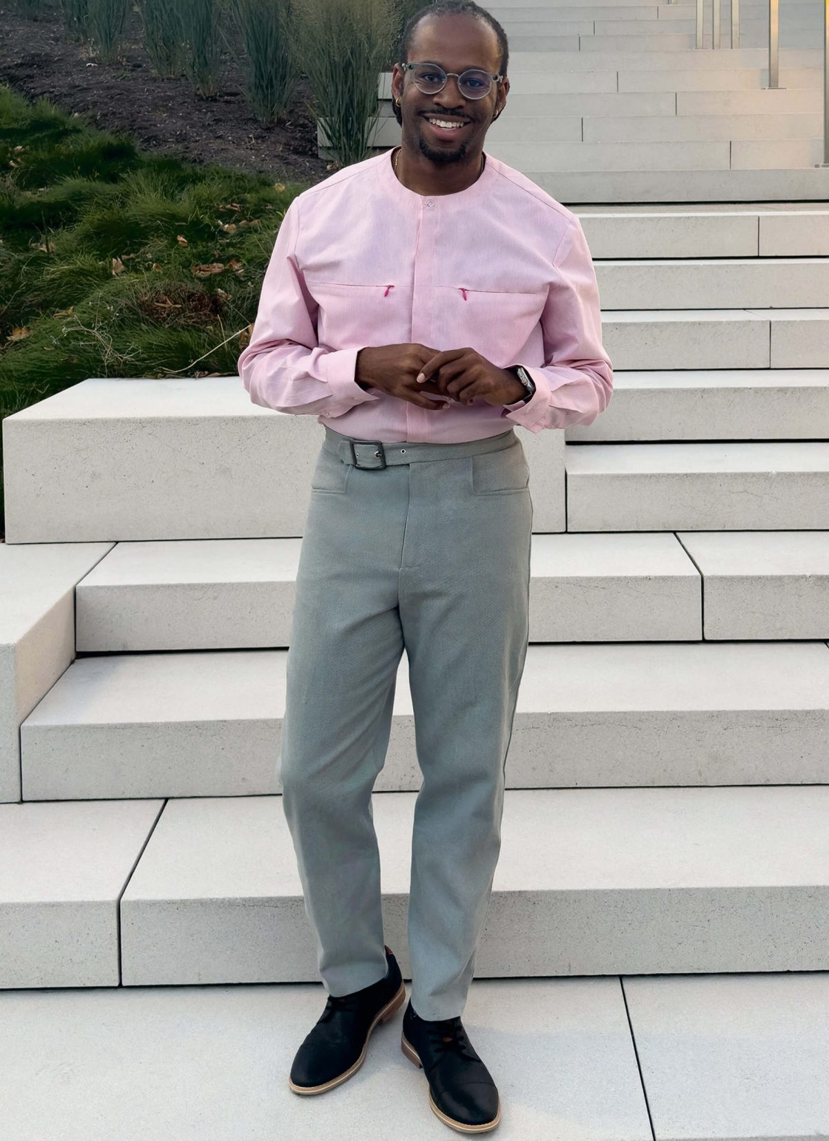 Sew Along to the new Know Me ME2113 View A&B with Julian (@juliancreates) in this step-by-step video. This Mens pattern features a collarless button up shirt patterns with front and back yokes have hidden zipper pockets, shirttail hem and long sleeves with button cuffs. View B has contrast yoke and sleeves. Pants have waistband with built in belt buckle, fly front zipper with hook and bar closure, front pockets and single welt back pockets.