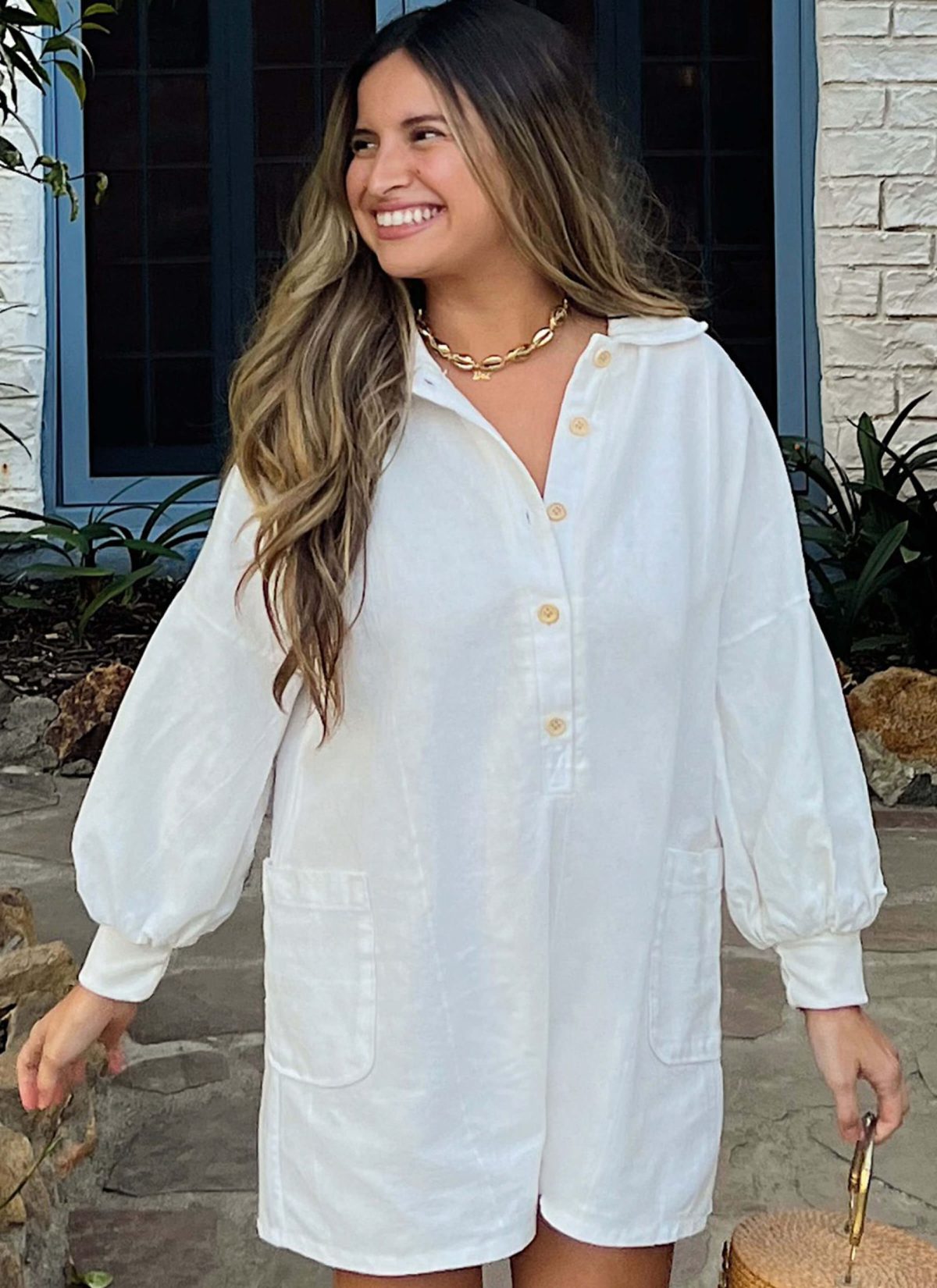 Sew Along to the new Know Me ME2074 with Alissah (@alissahthreads) in this step-by-step video. This Misses' pattern features an oversized dress and romper have dropped shoulders, bishop sleeves gathered into sleeve bands, side pockets, button front closure and neckline variations. View B has a shaped hem detail.