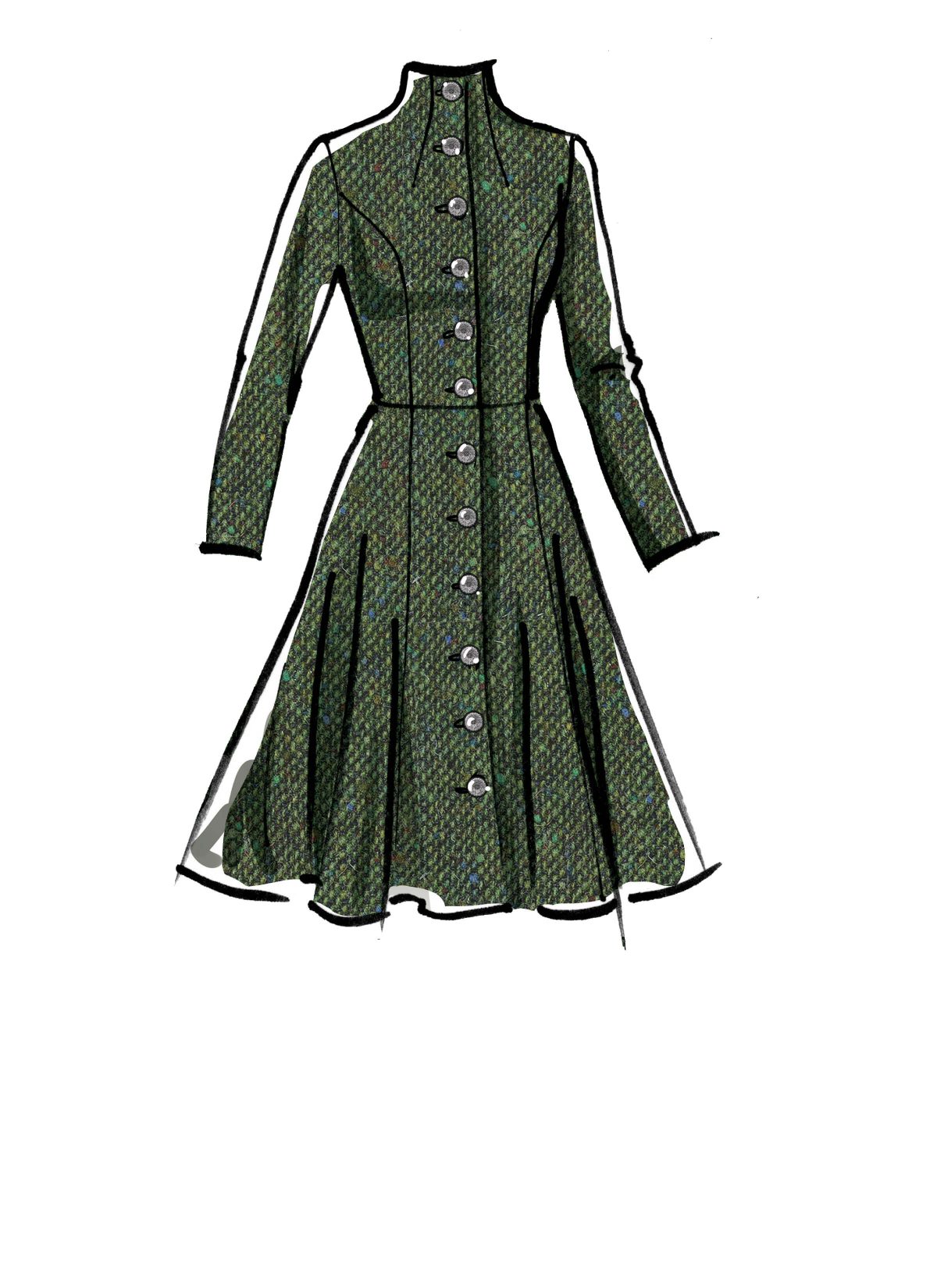 Fitted princess-seamed coat, with waist seam and flared skirt. Neckline and length variations.