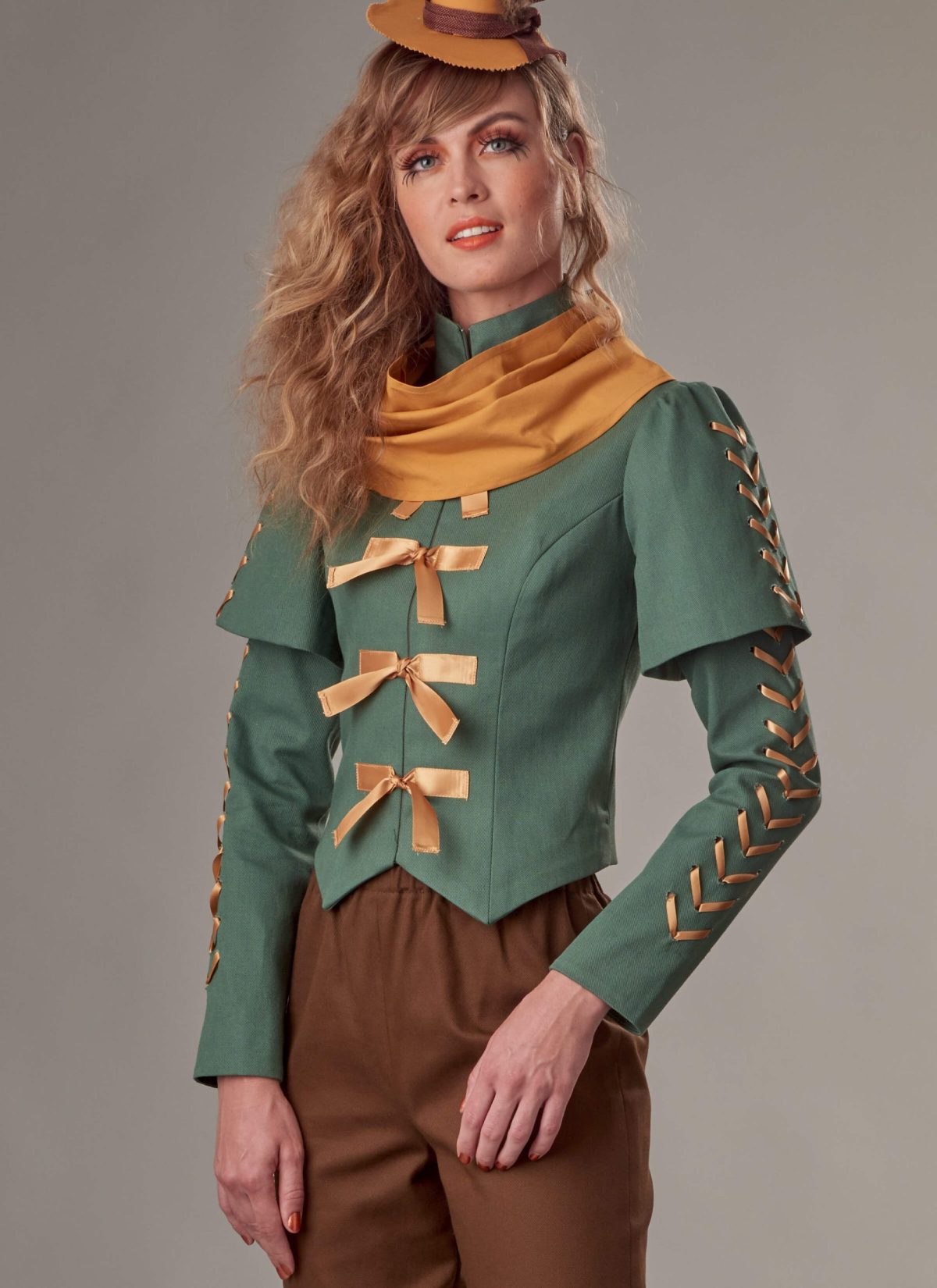 Misses’ costume includes a fitted high collar top with short bell sleeves and fun trim details. Wings are a fun addition. Easy bloomers and easy cowl.