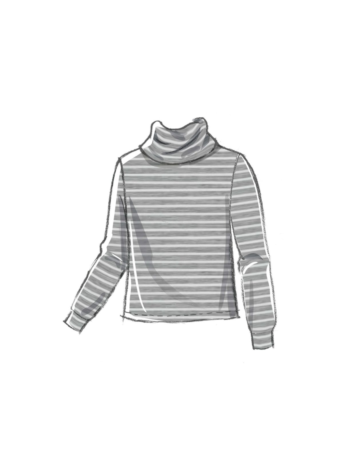 Easy to sew sleeveless or long sleeve knit top has fold over turtleneck. Pairs with either pull-on knit shorts, culottes or trousers with wide waistband, seaming detail. Optional front patch pockets. Sew Rating: Easy.