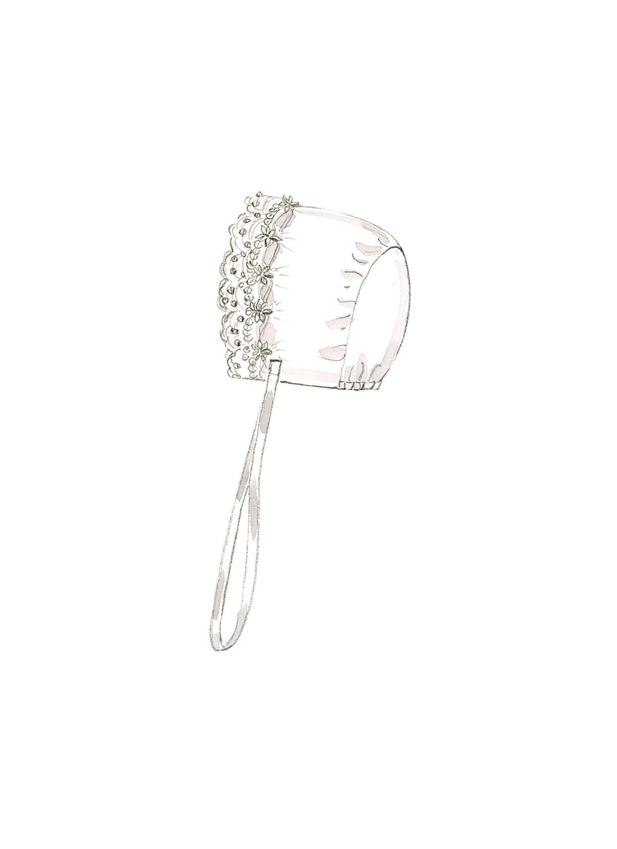 Gowns A, B, C, D have lined bodice with back button closure, short sleeves with trim and, overlay variations. Rompers E, F, in two lengths, have lined bodice, short sleeves, collar, back button closure and snap crotch. Lined bonnet for all views is included. Sew Rating: Average.