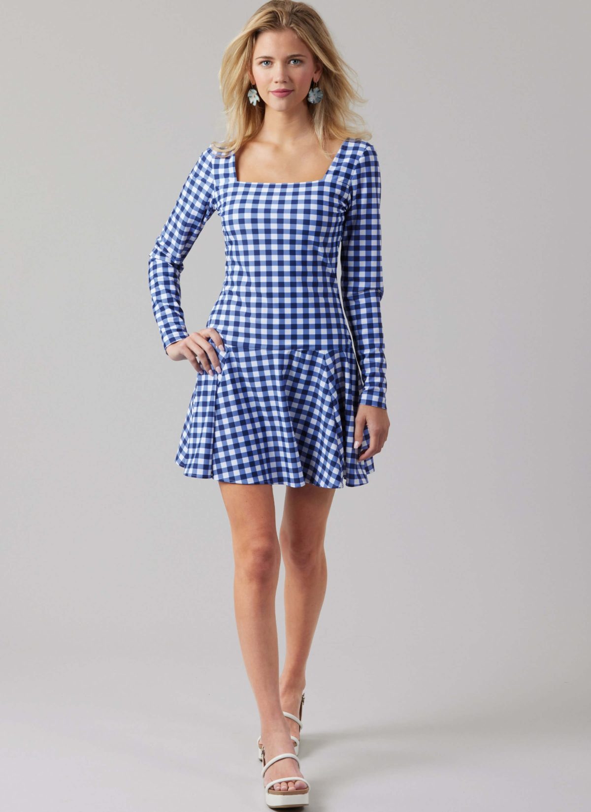 Sew Along with Nefertiti to the new McCall's M8551 View B with View A sleeves in this step-by-step video. This Misses pattern features knit dress with fitted bodice, flare skirt, square neckline, sleeve and length variations. View A mini length dress has long sleeves. View B dress has short sleeves, open skirt slit and mid-calf length. View C has shoulder straps, open skirt slit and ankle length.