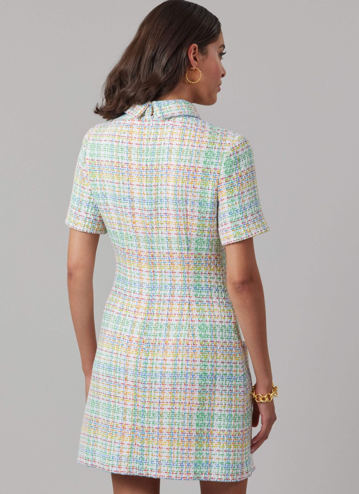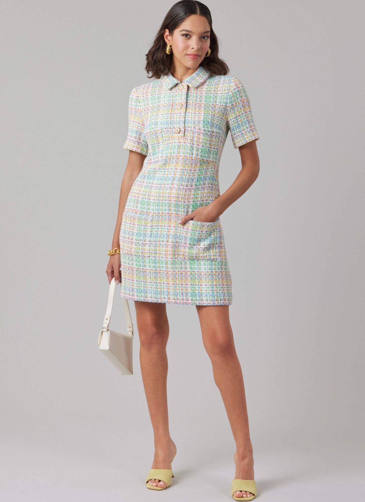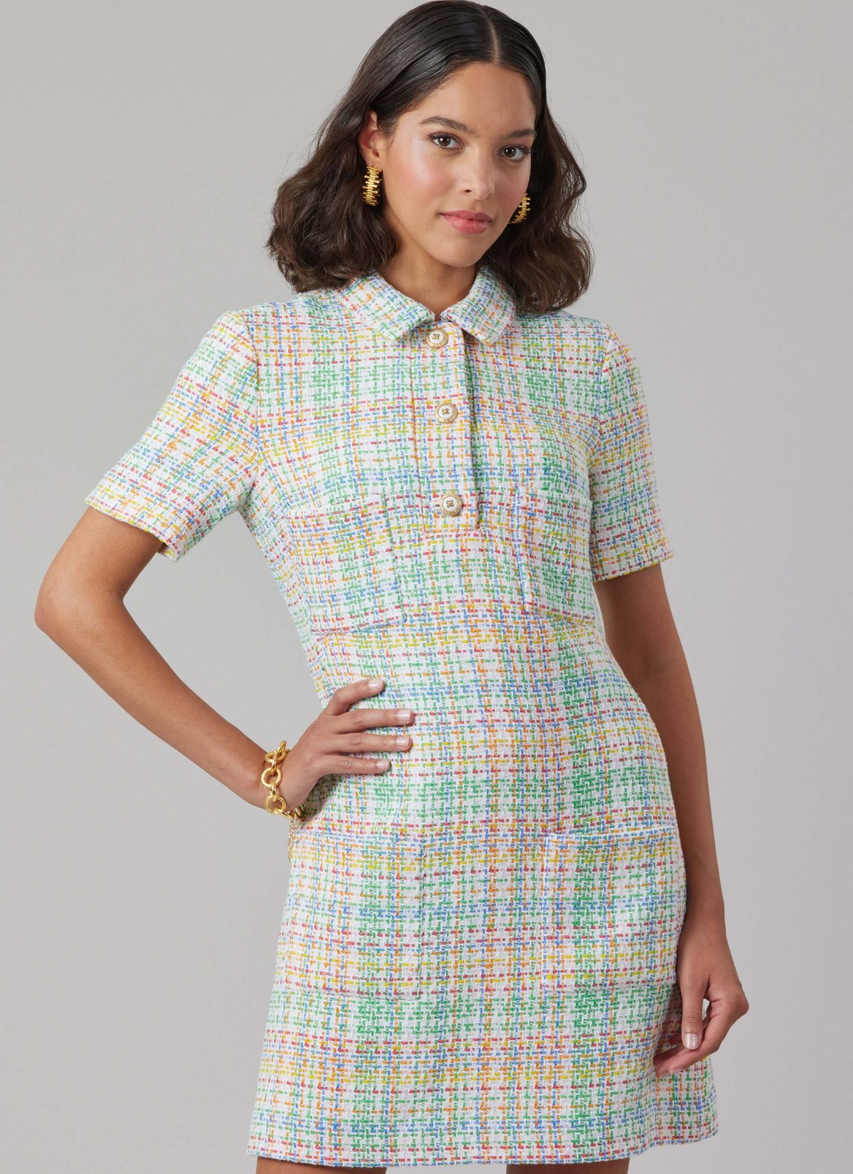 Lined, fitted, slightly a-line shift dresses have french darts, polo collar, front placket opening, invisible back zipper and lined patch pockets. View A has short sleeves. View B and C have long sleeves with button cuffs and continuous lap opening. View C has contrast collar and cuffs.