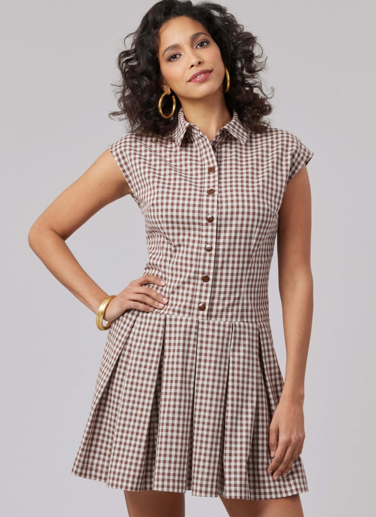 Drop waist front button dress with sleeve and length variations has collar, collar band, box pleats and invisible side zipper closure.