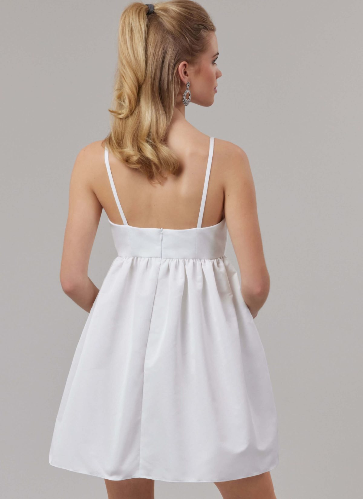 Empire waist dress, close-fitting through bust, has sweetheart neckline, double bow front, lined bodice and narrow straps. Full skirt has side front pockets, no side seams. Invisible back zipper and unlined skirt.