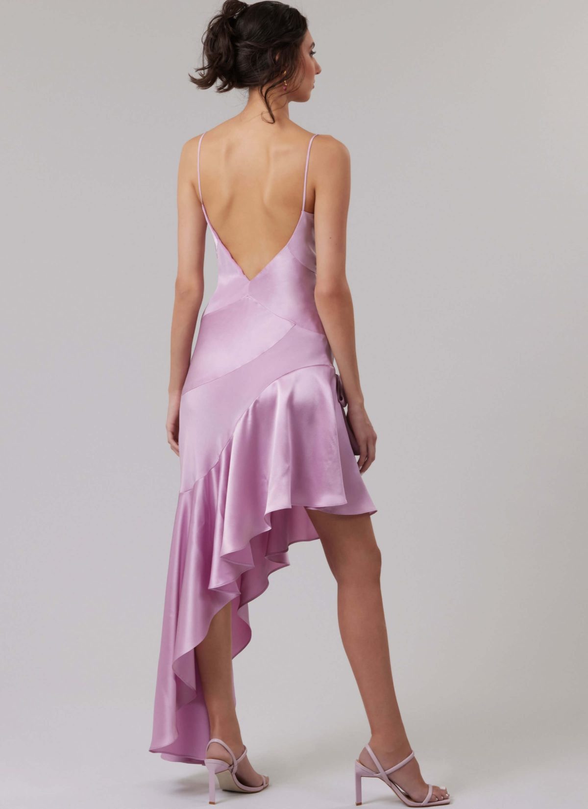 Lined, fitted, bias cut dress has spaghetti straps, low back, bow detail and invisible side seam zipper. Views B and C have hi-low hem. View B has contrast.