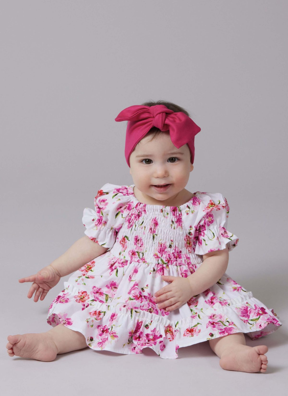 Sew Along to the new McCall's 8591 with Raven Maureen (@)ravenmaureen_) in this step-by-step video. This pattern features a shirred baby romper and dresses have elastic neckline, ruffled sleeves and purchased snap tape closure. Views B and C have gathered tier and ruffles at skirt. Complete the outfit with the matching bow headband.