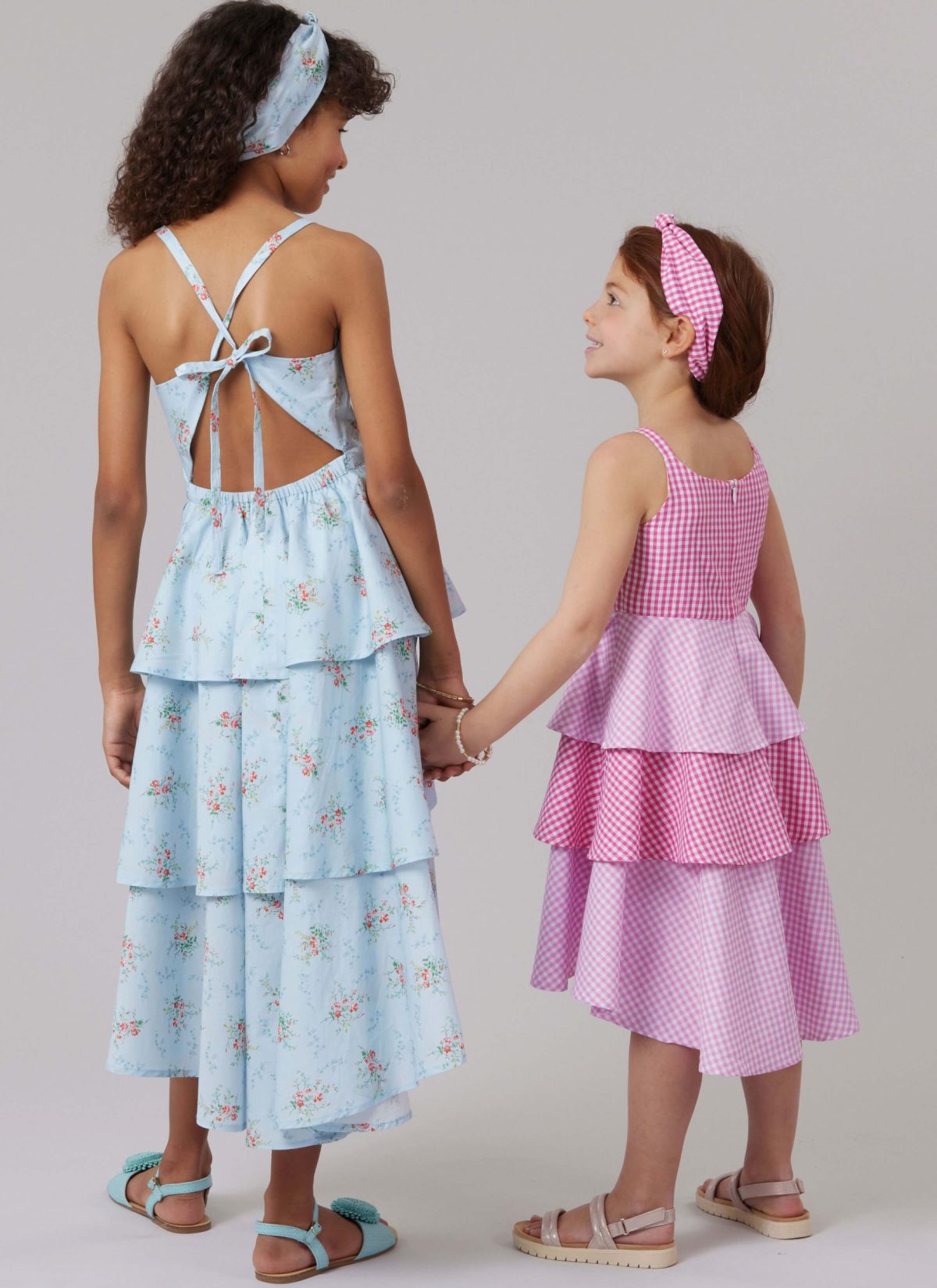 Dresses with straps or shoulder ruffle sleeves have scoop neckline, flounce layered skirt and high-low hems. View B dress has contrast on the skirt. Headband comes in four sizes: XS (18”), S (19”), M (20”), L (21).