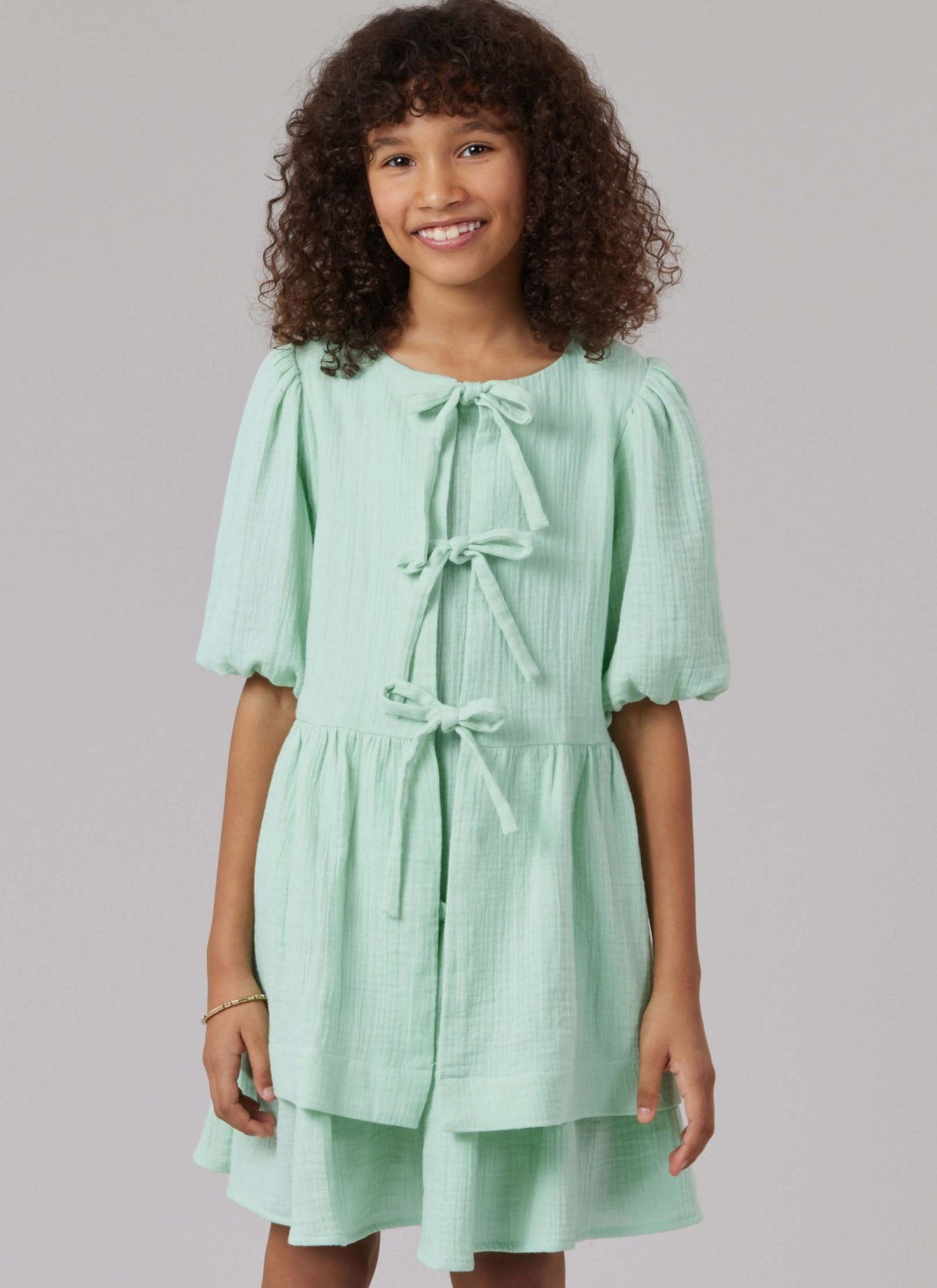 Create these adorable dress and top patterns for Girls sizes 7 to 14. Sleeveless dress has full gathered skirt, folded ruffles and invisible back zipper closure. Round neck top with front ties has gathers at waist and sleeves.