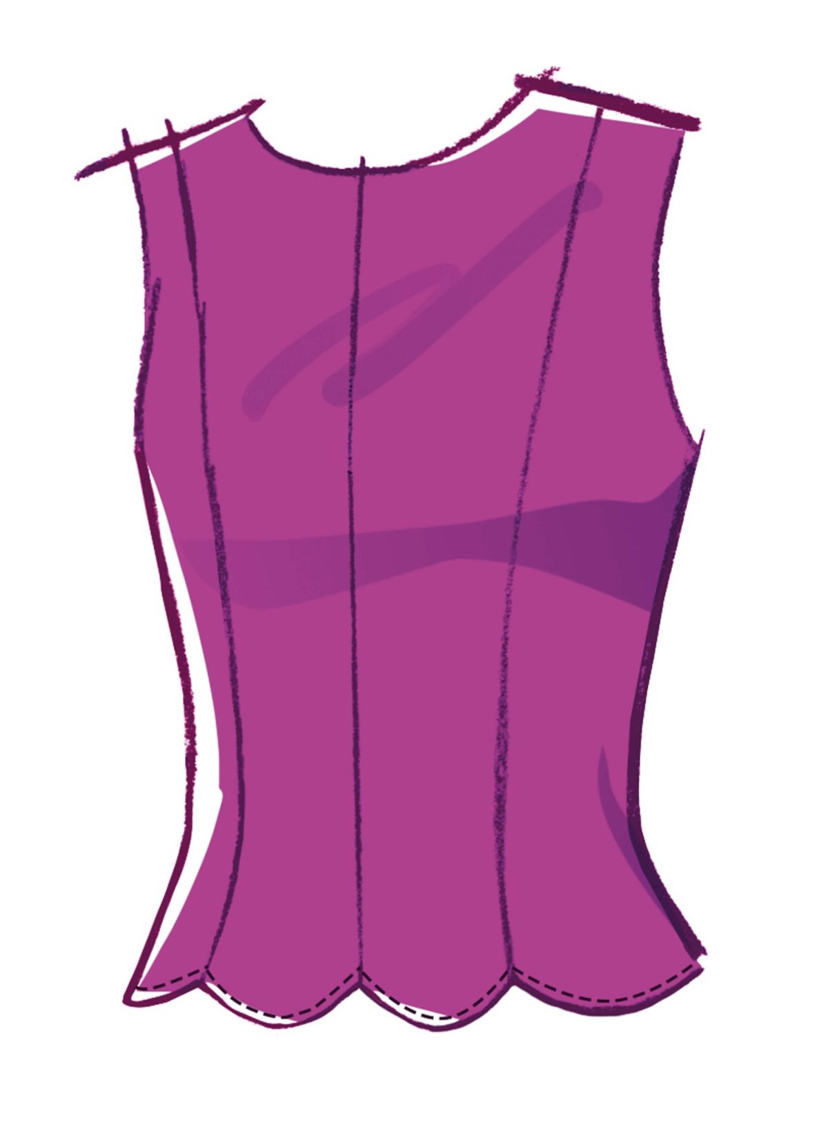 Sleeveless knit top and skirt have scalloped hem and invisible zipper closure. Views B and D have contrast panels.