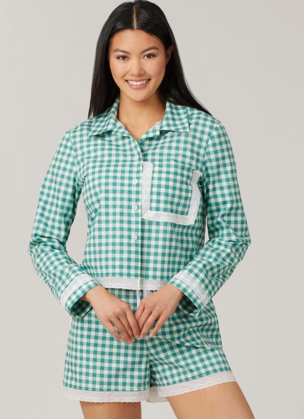 Bralette has ruffle shoulder straps and elastics at neckline and hem. Button front shirt has collar, long sleeves with cuffs and chest pocket. Shorts have elastic at waist and purchased ribbon ties. All views have purchased scalloped eyelet trim.