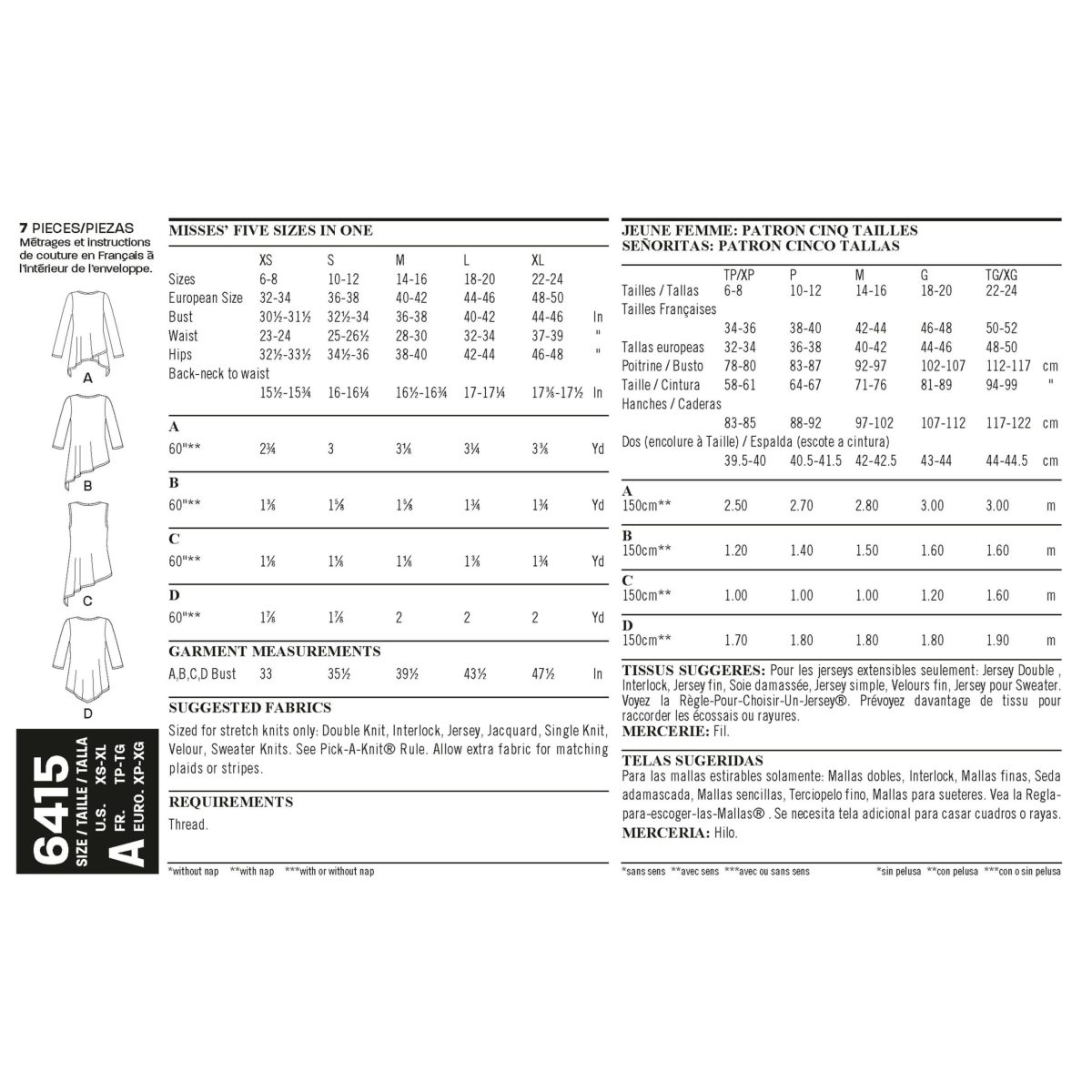 Sized for stretch knits only: Double Knit, Interlock, Jacquard, Jersey, Single Knit, Velour, Sweater Knits. See Pick-A-Knit Rule.