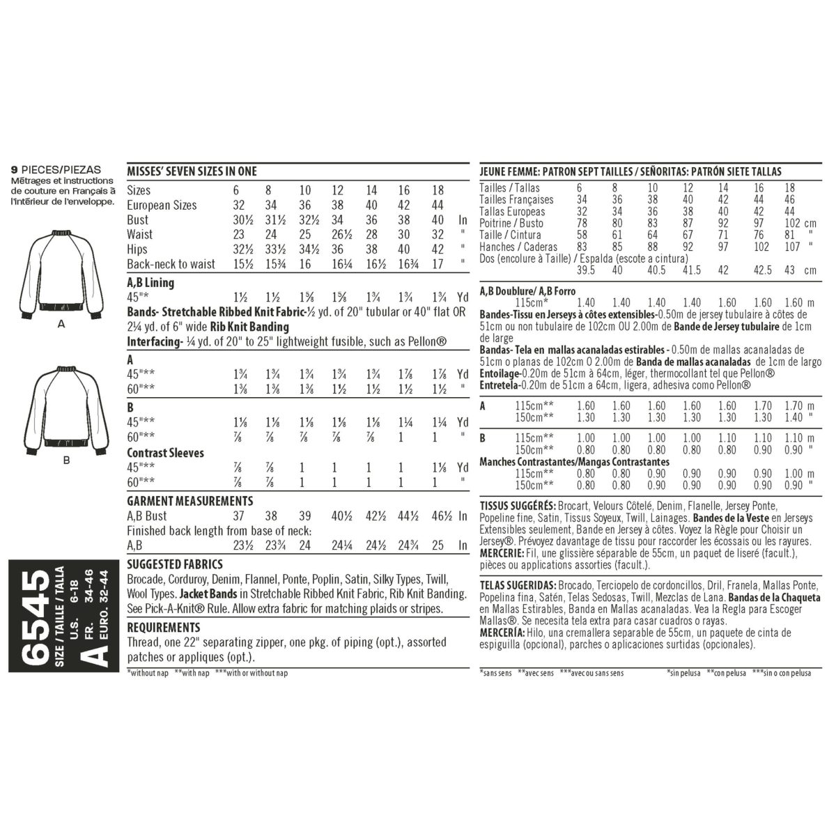Classic letterman’s varsity jacket with raglan sleeve that include directions for optional contrast sleeves. Great for brocade, wool or denim fabrics. Blank canvas for you to embellish using patches, letters and trimmings.