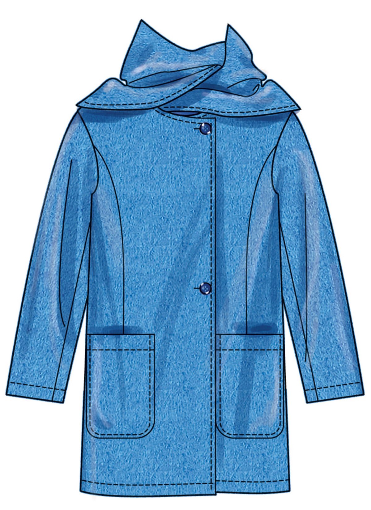 Loose fitting lined coats with attached scarf have dropped shoulders, front dart shaping, front button closure, patch pockets, topstitching, stitched hems, and length variations.