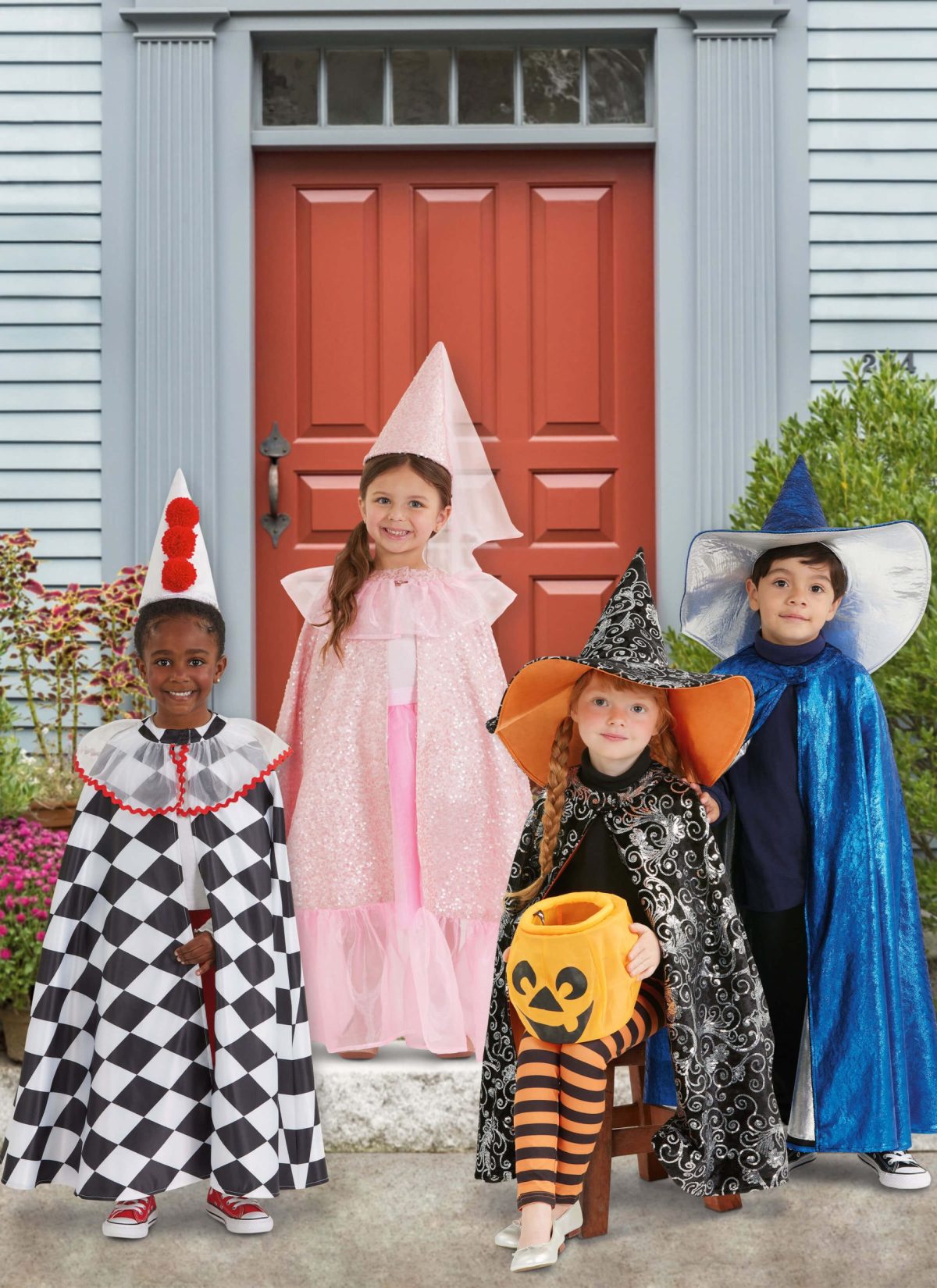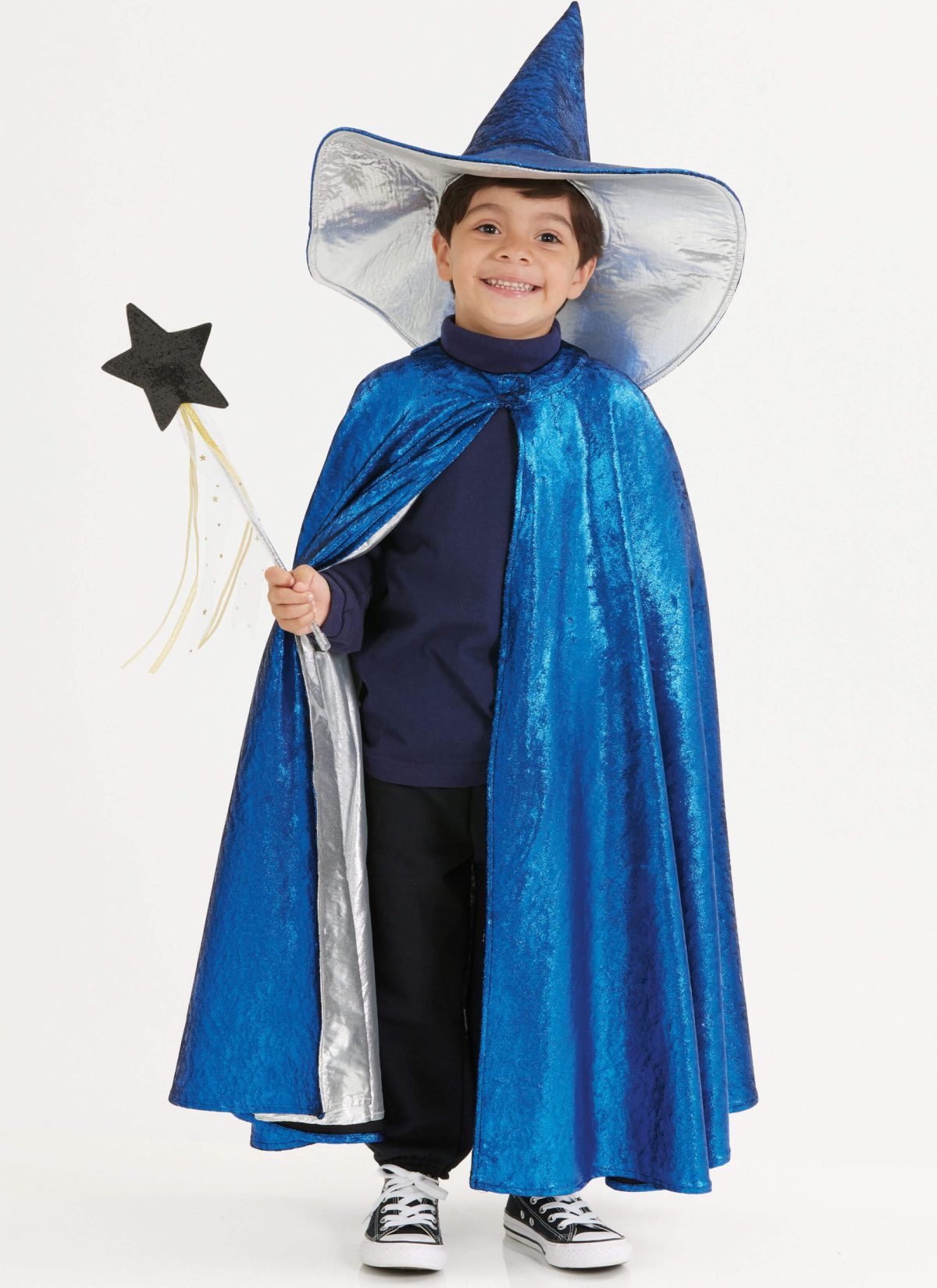 Lined capes in calf or knee length have neck bands with front hook and loop tape closures and can be made with contrast neck ruffle or contrast neck and hem ruffles. Neck ruffle can be accented with rick rack trim. Hats in three sizes S-M-L have stiff interfacing to help hold their shape. Witch or wizard hat has contrast brim and lining; clown hat has yarn pom poms; princess hat has sheer cascading veil. See envelope for more information.