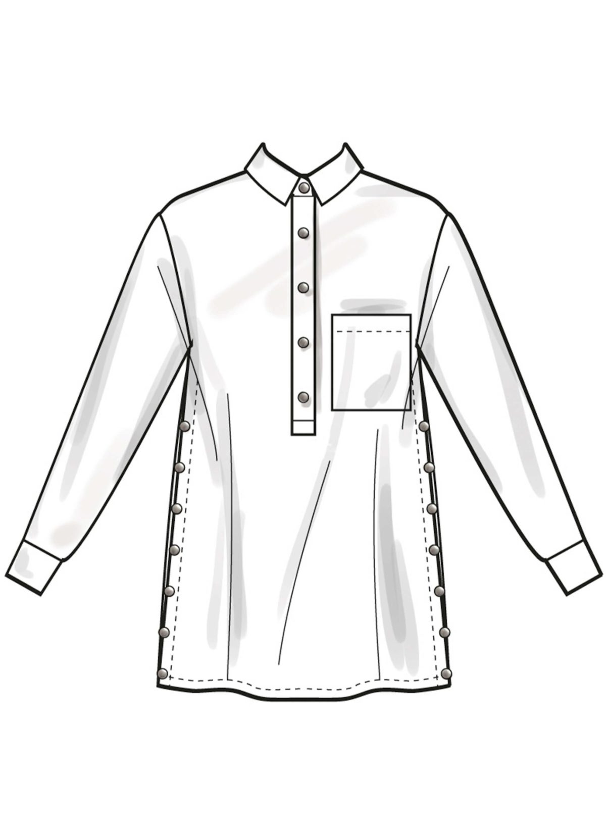 Misses’ Top and Tunics feature metal snaps at side seams, fold down collar, partial front placket with snaps, front patch pocket, and pleated sleeves with snaps at cuffs. View A top has narrow hem. View C tunic has contrast collar, placket and cuffs.