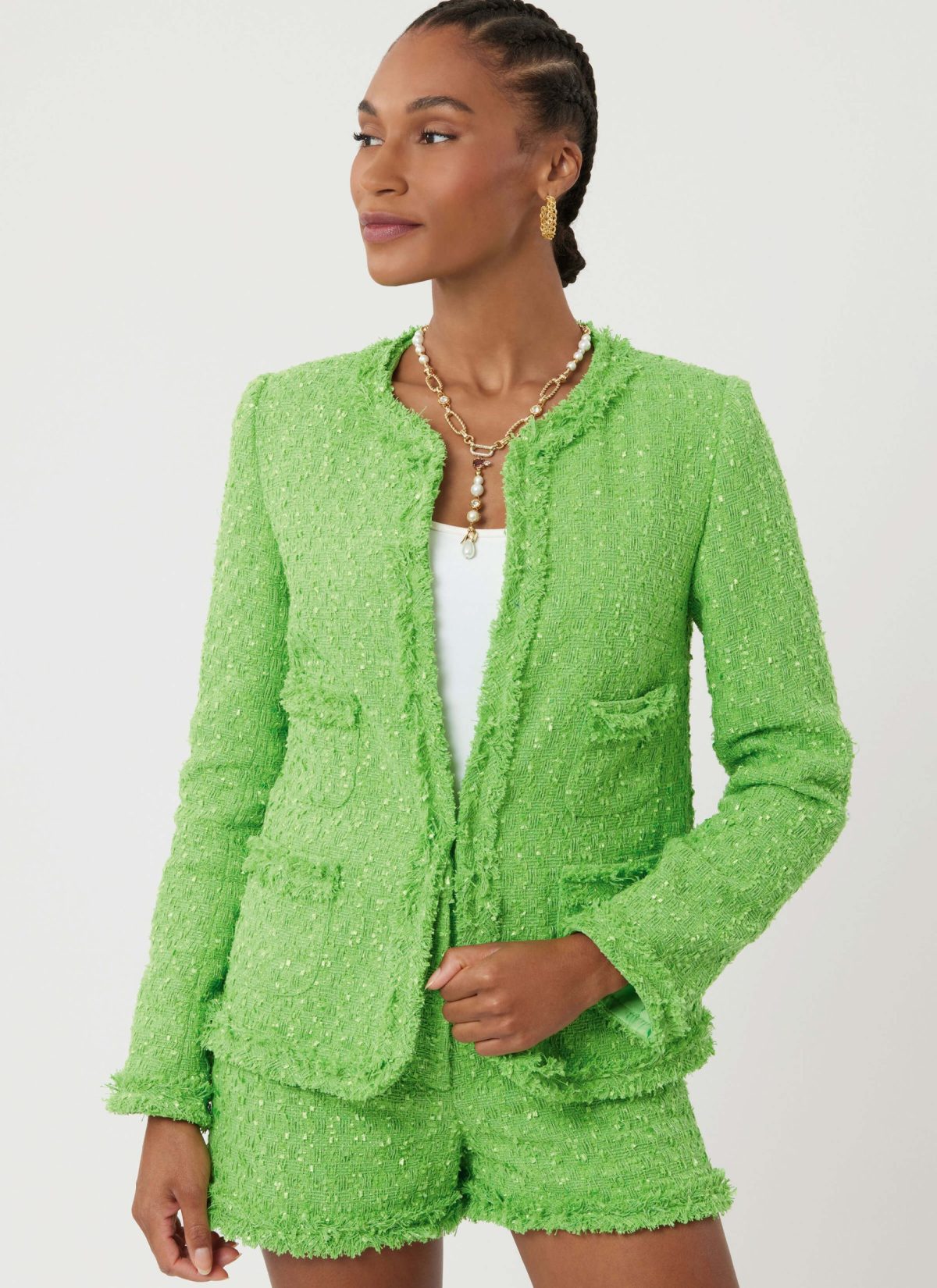 Fitted, lined cardigan style jacket has self-bias fringe, front hook and eye closure, shoulder pads, long two-piece sleeves, bust darts and patch pockets. Fitted, wide leg trousers or shorts have contoured waistband with button closure, zipper fly and self-bias fringe.