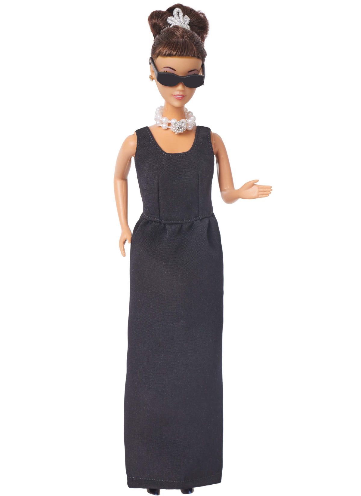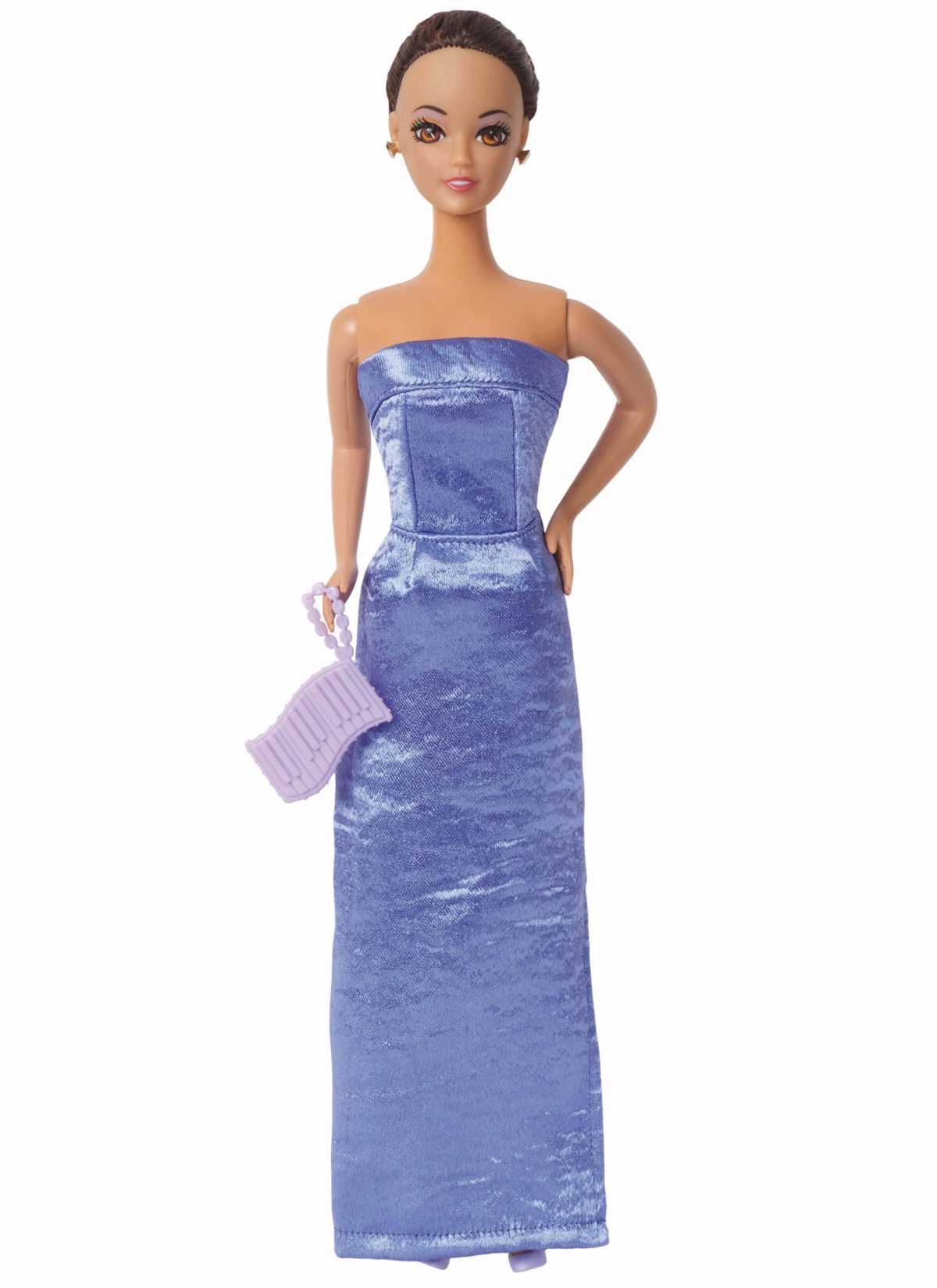 Glamorous dresses and gowns for 11-1/2″ fashion dolls inspired by the silver screen have fitted bodices, slim skirts and back snap closures. Short sleeveless dress with fringed hem trim has ribbon belt with rosette trim. Sleeveless gown has racer back and lightly gathered skirt. Strapless gowns with side slits have bodice bands and can be made with attached back train. Knee length strapless cocktail dress has removable high-low overskirt and purchased applique accents. Strapless gown with side slit is worn with contrast tunic that has kimono sleeves and asymmetrical tails. See envelope for more information.