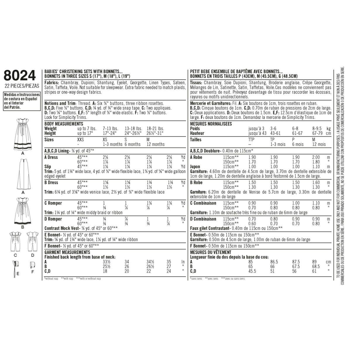 Simplicity Sewing Pattern 8024 Babies’ Christening Sets with Bonnets