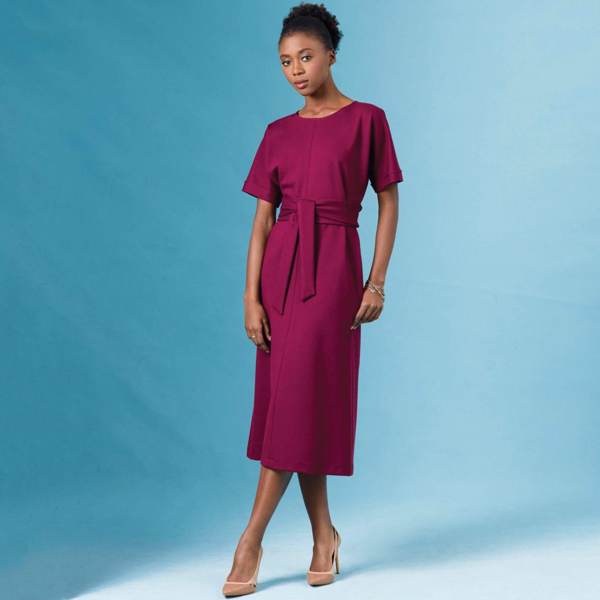 Easy to Sew Misses’ Dresses. Pull-on style with centre front and back seams, fastens at back neck. Obi-style belt. Dress and sleeve length variations. Suitable for light-to-medium weight fabrics.