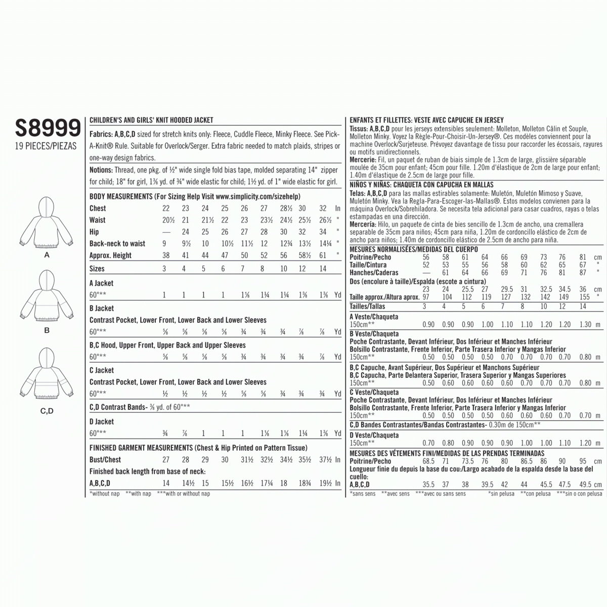 Simplicity Sewing Pattern S8999 Children’s and Girls’ Knit Hooded Jacket