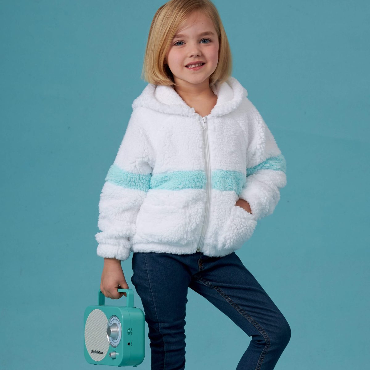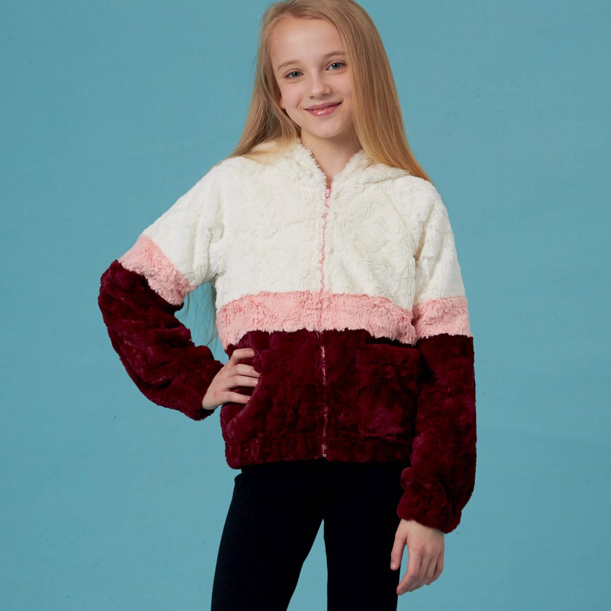 Children’s and Girls’ Hooded Jackets. Blouson-style with front zipper fastening and elasticated hem. Sleeves have elasticated cuffs. Designed and sized for stretch knits only. Can be constructed using an overlocker/serger.