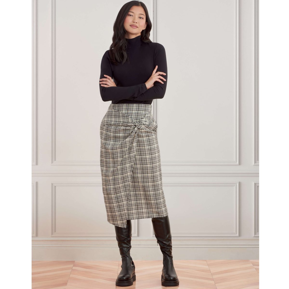 Faux wrap skirt with twist has side seam pockets, front and back darts and center back invisible zipper. Variation for flat wrap front with button closure on extended strap.