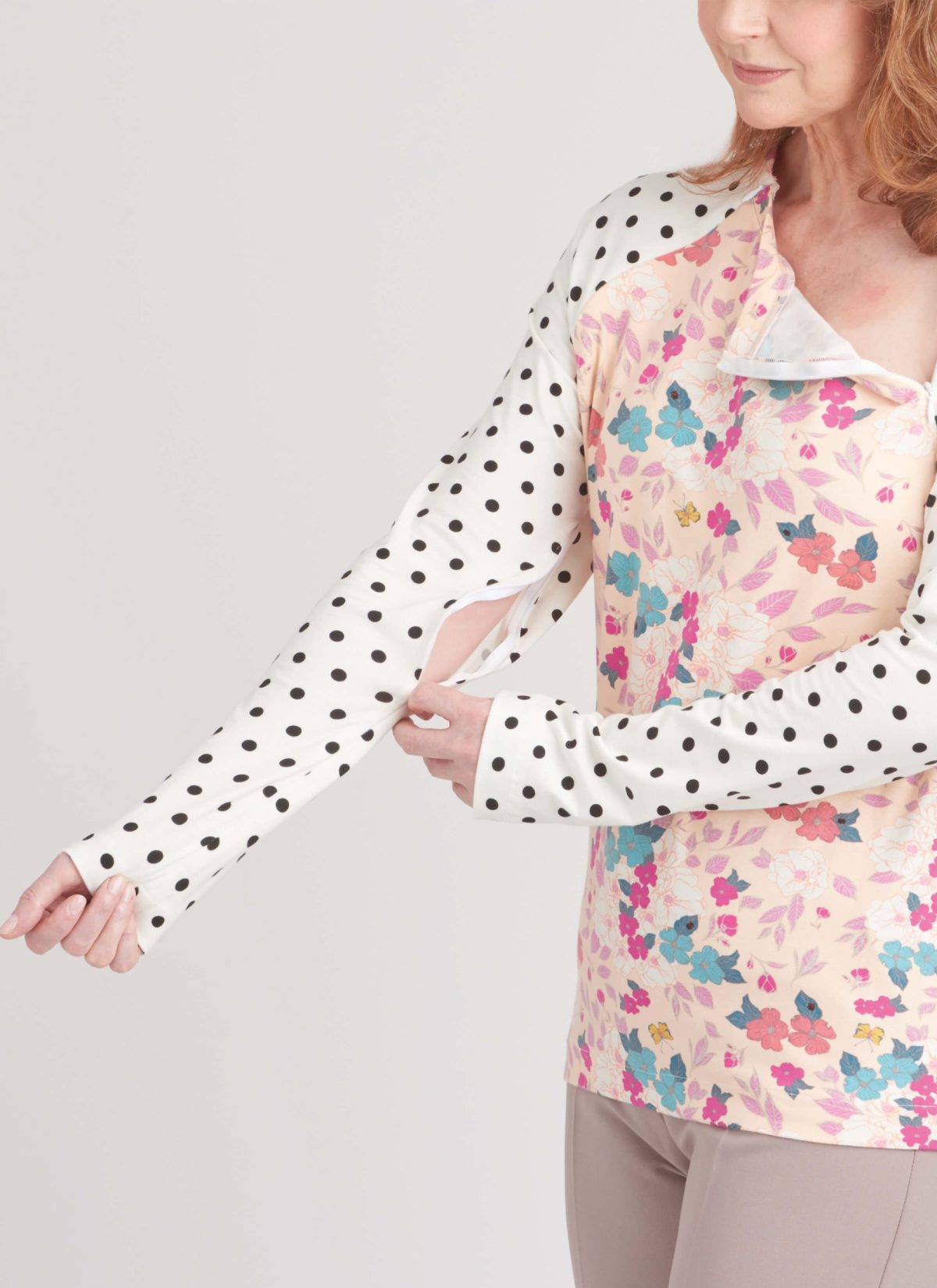 This flattering fit and year-round style makes this shirt a top treatment essential. Knit tops with long sleeves have invisible zippers in the raglan sleeve seams for easy port access. Simplicity Adaptive Range.