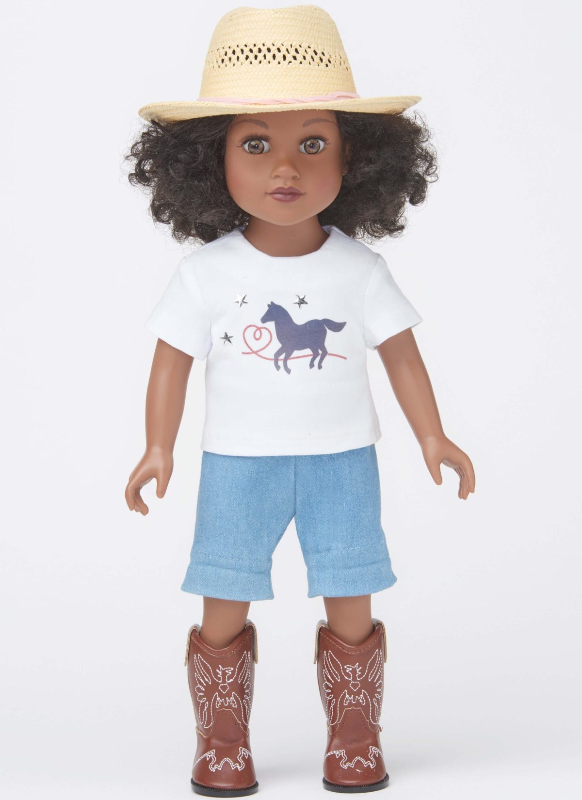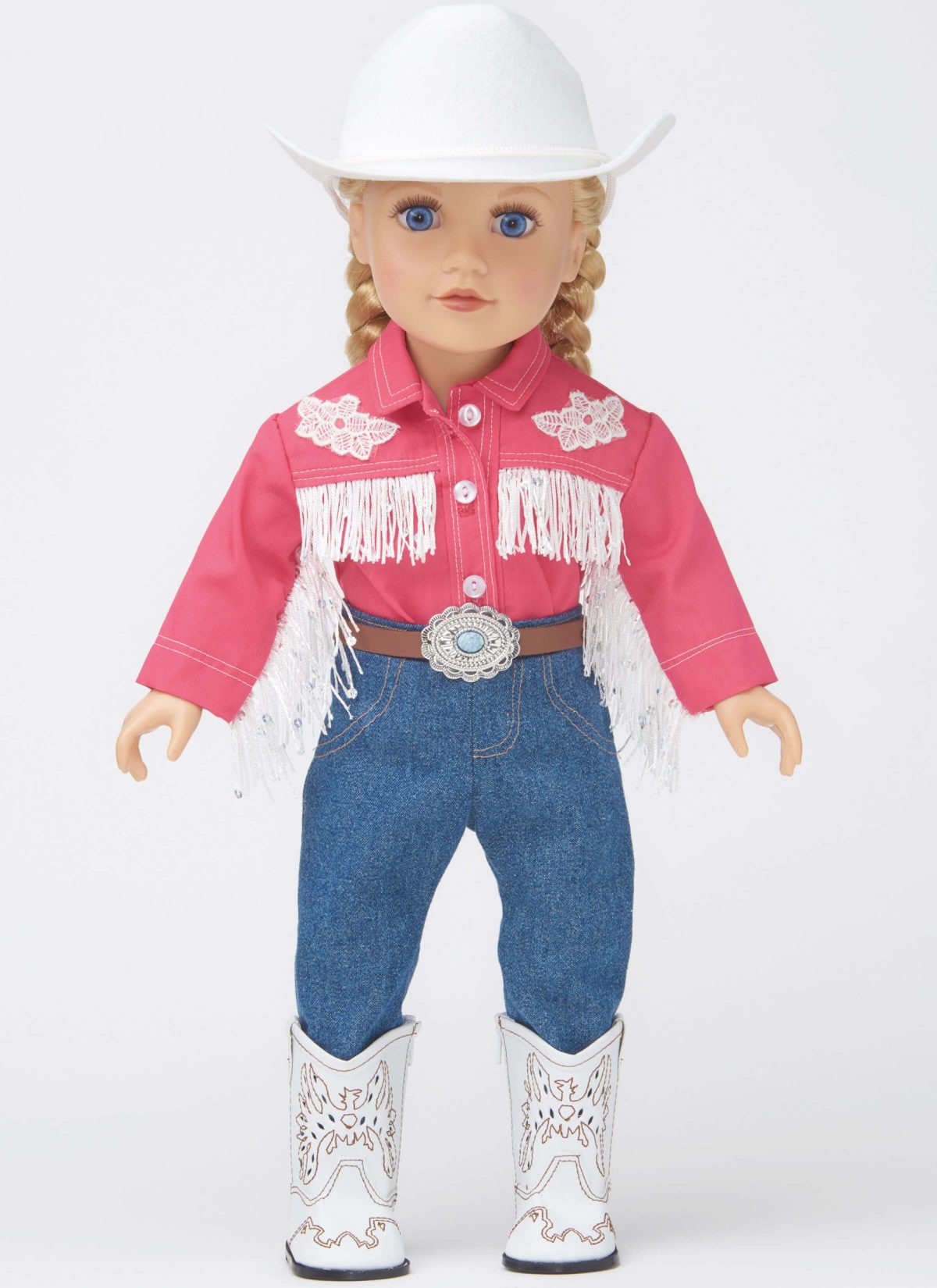 Western-inspired wear for 18″ (46cm) dolls. Knit T-shirts with long or short sleeves have back hook and loop closure. Shirt and jacket with front buttons and pointed collar have long sleeves, front yokes, and trim and fringe options. Overalls-style jumper and skirt have gathered tiers; jumper has straps with mini suspender clips. Pants and shorts have jeans-style top stitching. See envelope for more information.