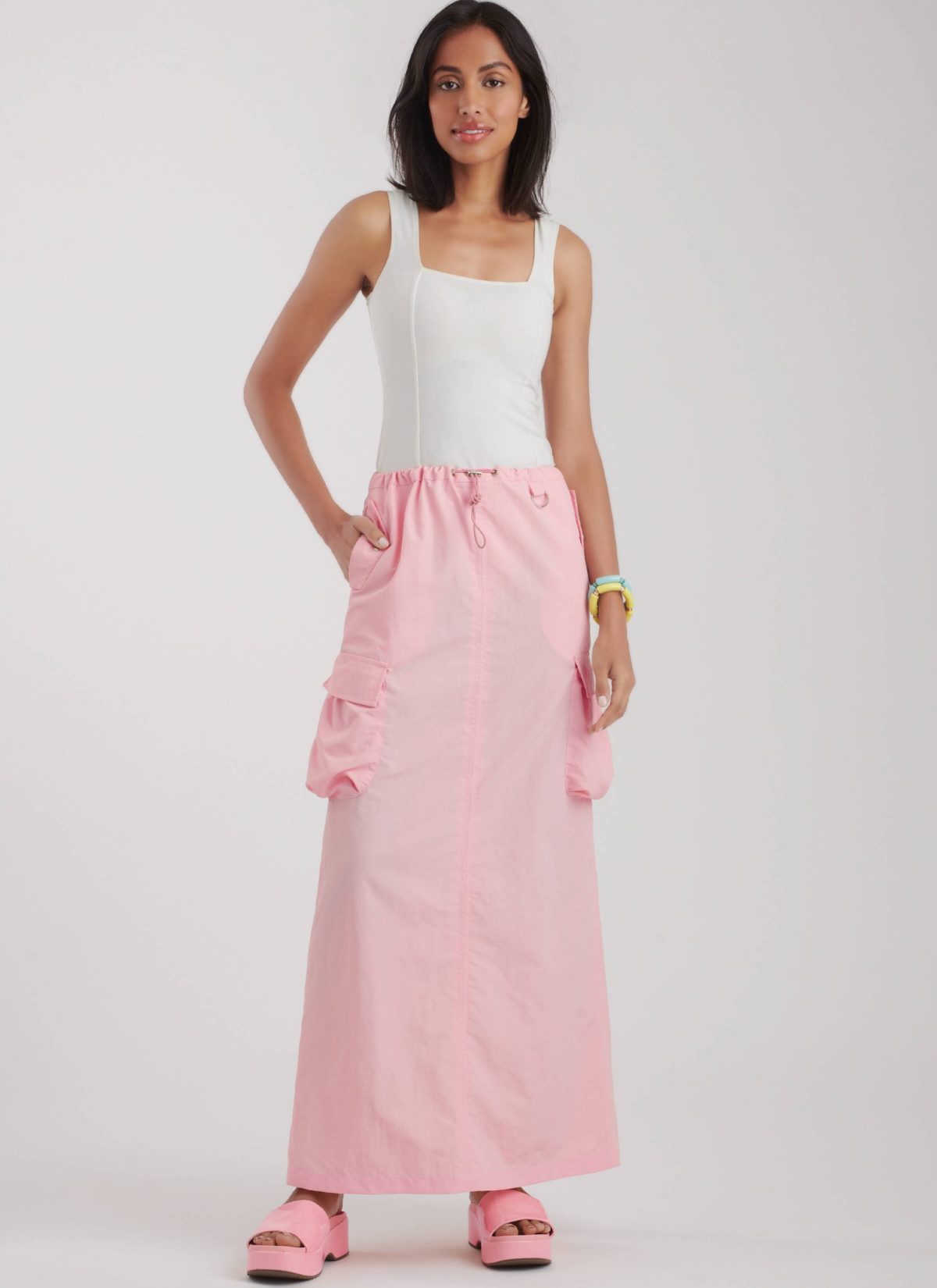 Cargo skirts with drawstring waist band Side seam pockets with flaps and snap button closures. Skirts B and C have patch pockets and back vents. Sew Rating: Average.