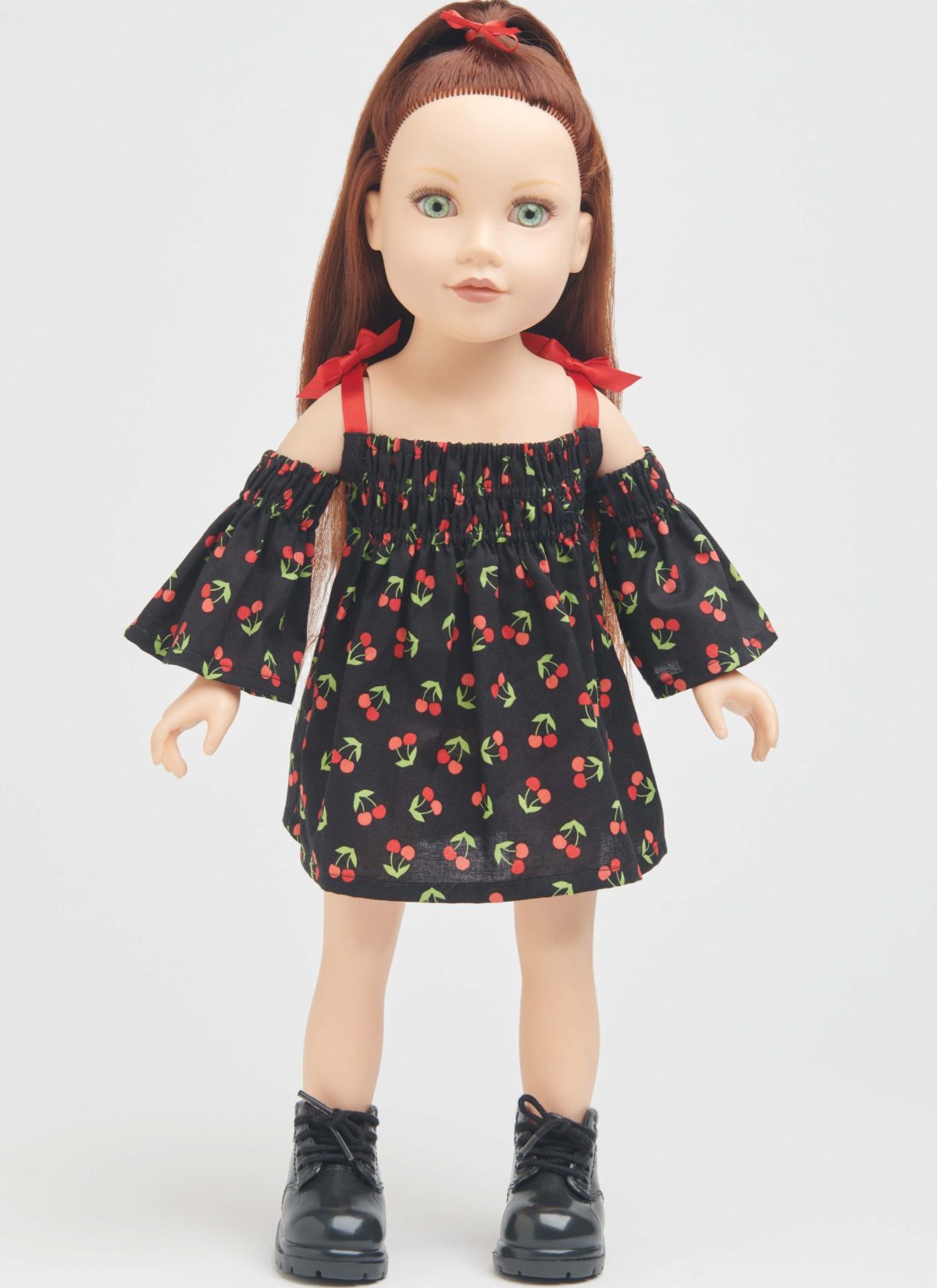 Outfits for 18″ (46cm) dolls. Dresses have shirred bodices, gathered skirts and bias-bound armholes with snap-shut ribbon straps and bow accents. Options include shirred bell sleeves or tulle overskirts. Jumpsuit with shirred bell sleeves and wide leg bottoms has contrast bodice. The two-piece outfit has shirred crop top with contrast sleeves and pull-on shorts with gathered overskirt and contrast waist. sew Rating: Average.