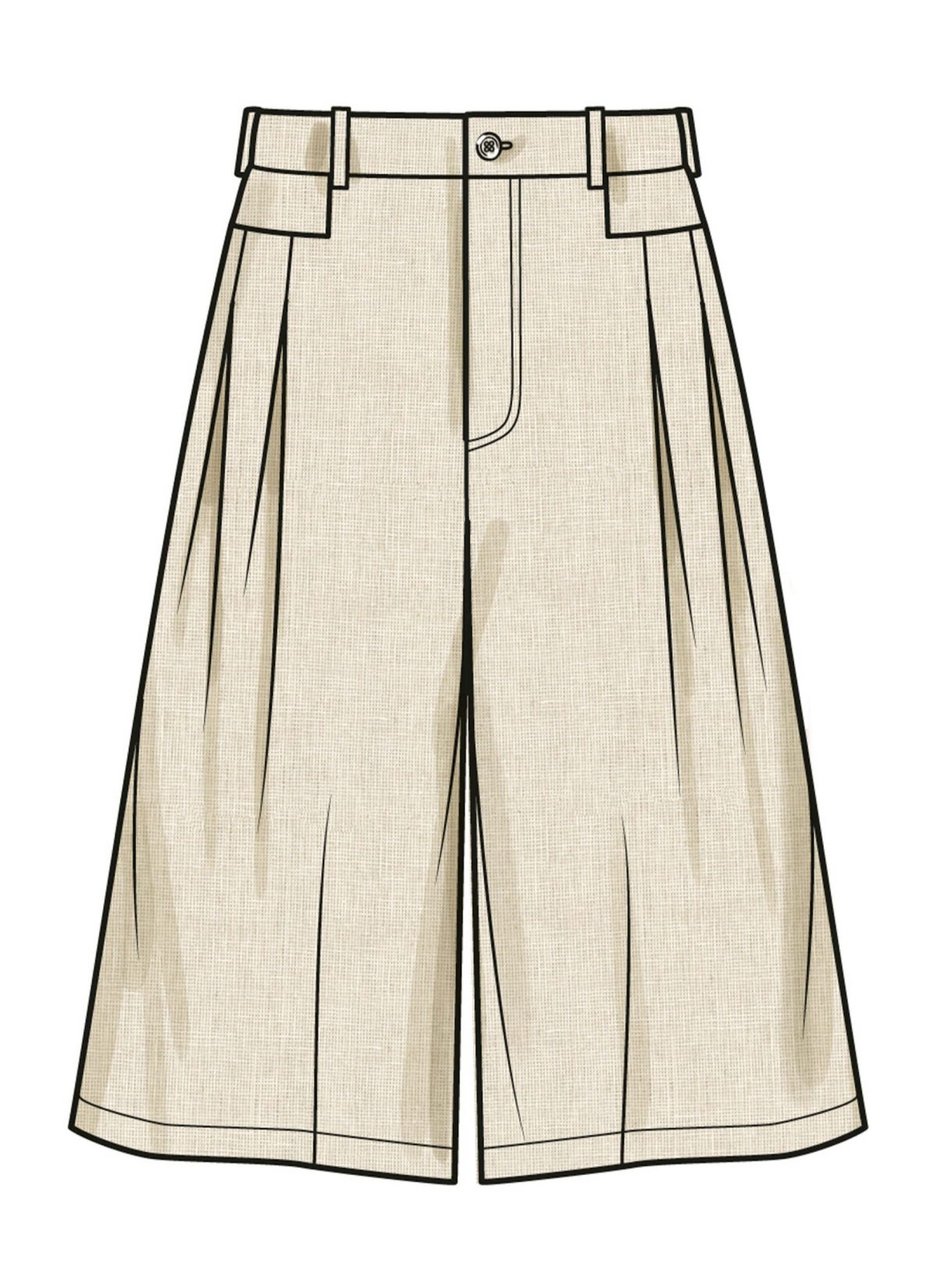 Pleated shorts and trousers have side seam pockets, front fly zipper with button closure and wide leg. View B cropped trousers, View C full length.